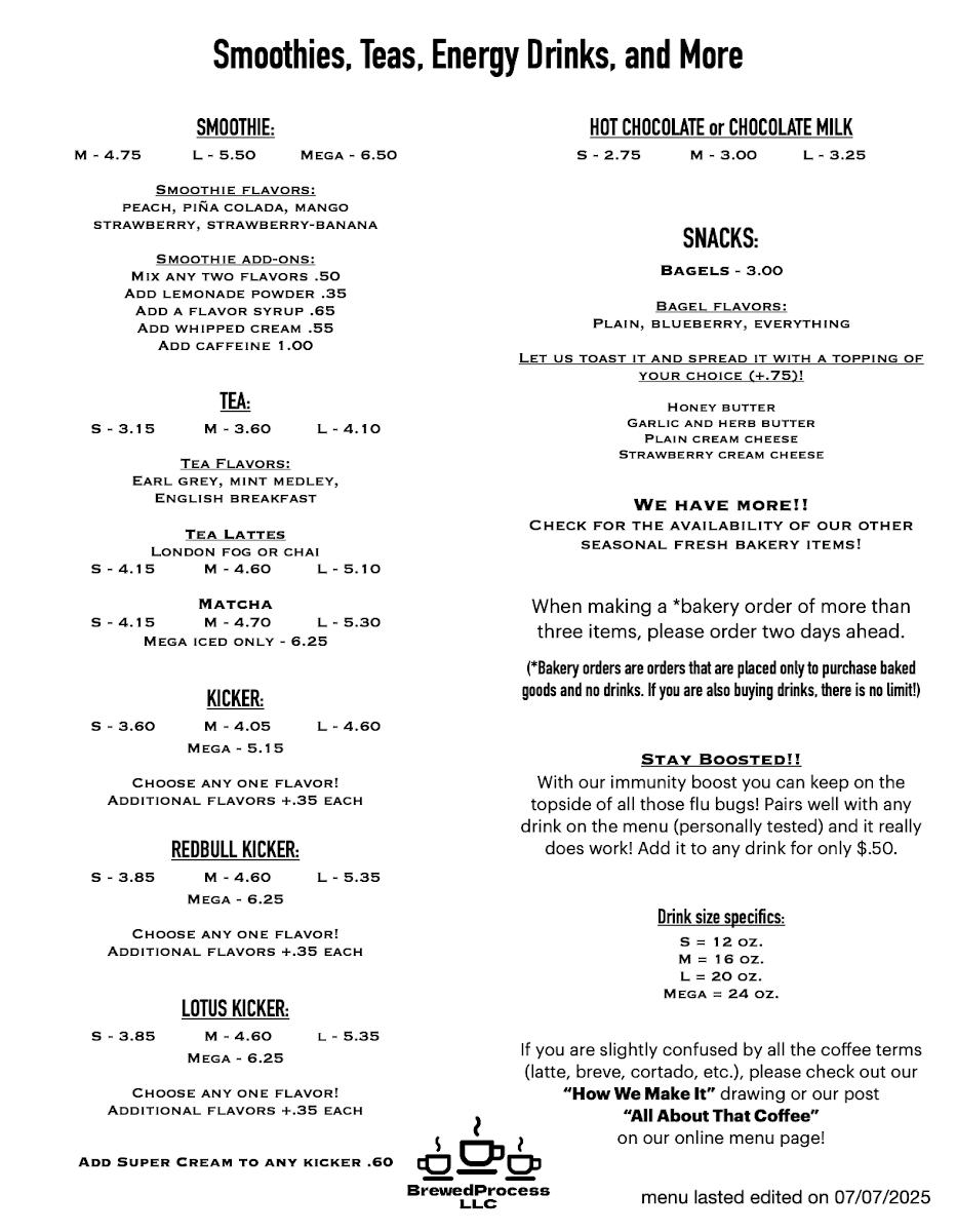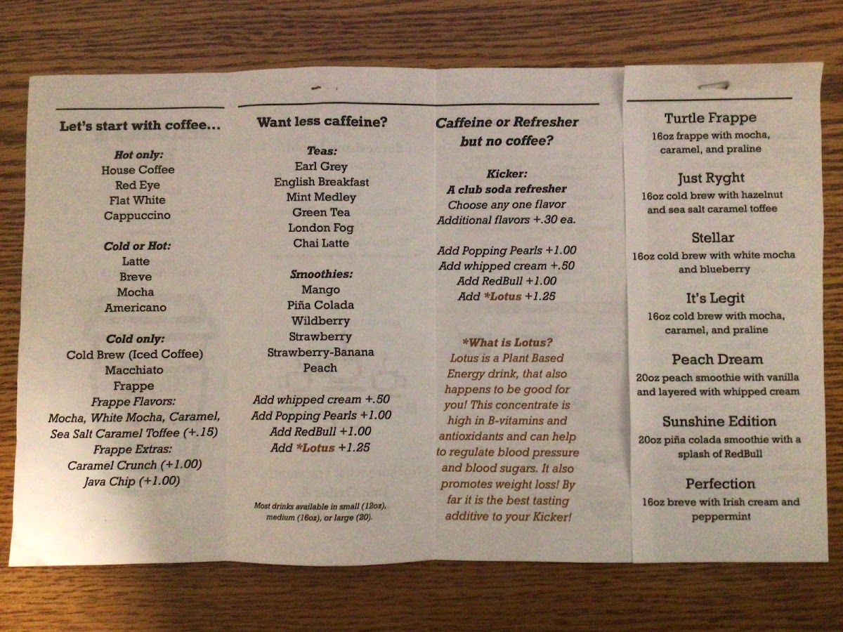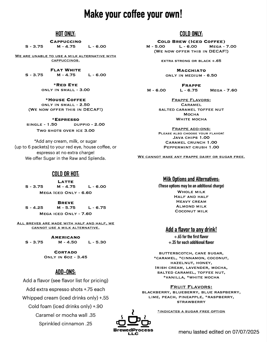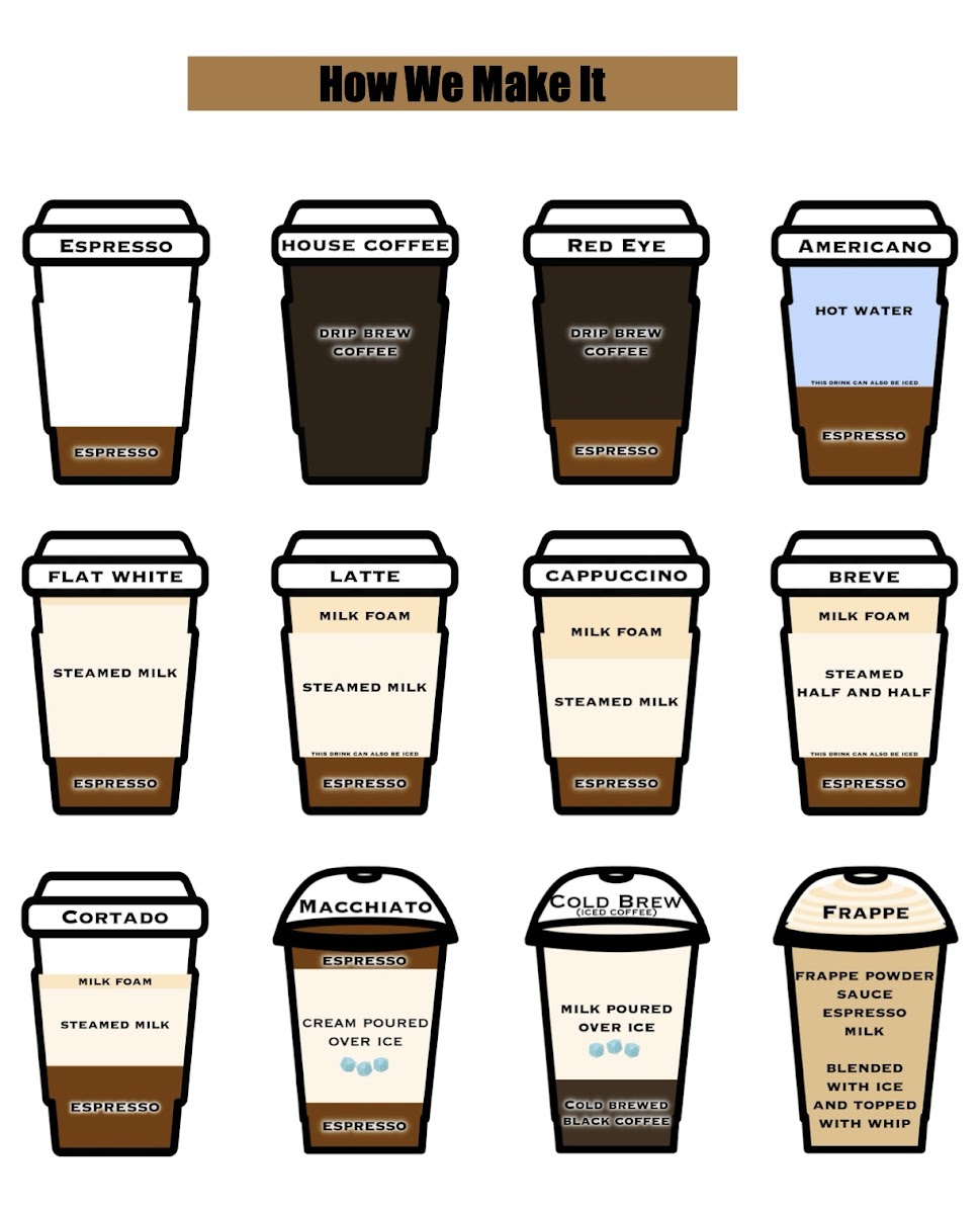 16oz: Three shots of espresso layered with caramel sauce, heavy whipping cream, and half and half, poured over ice.
