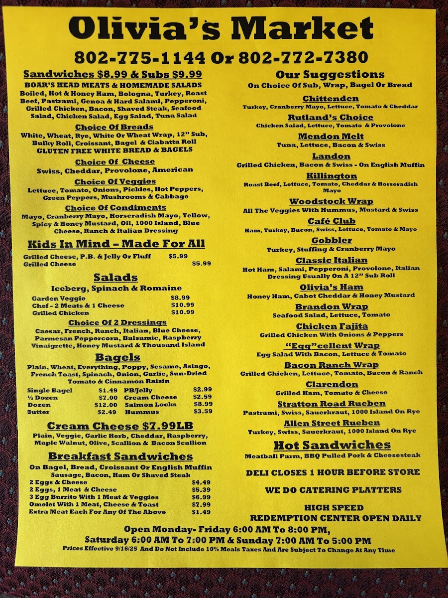 Olivia's Market Menu
