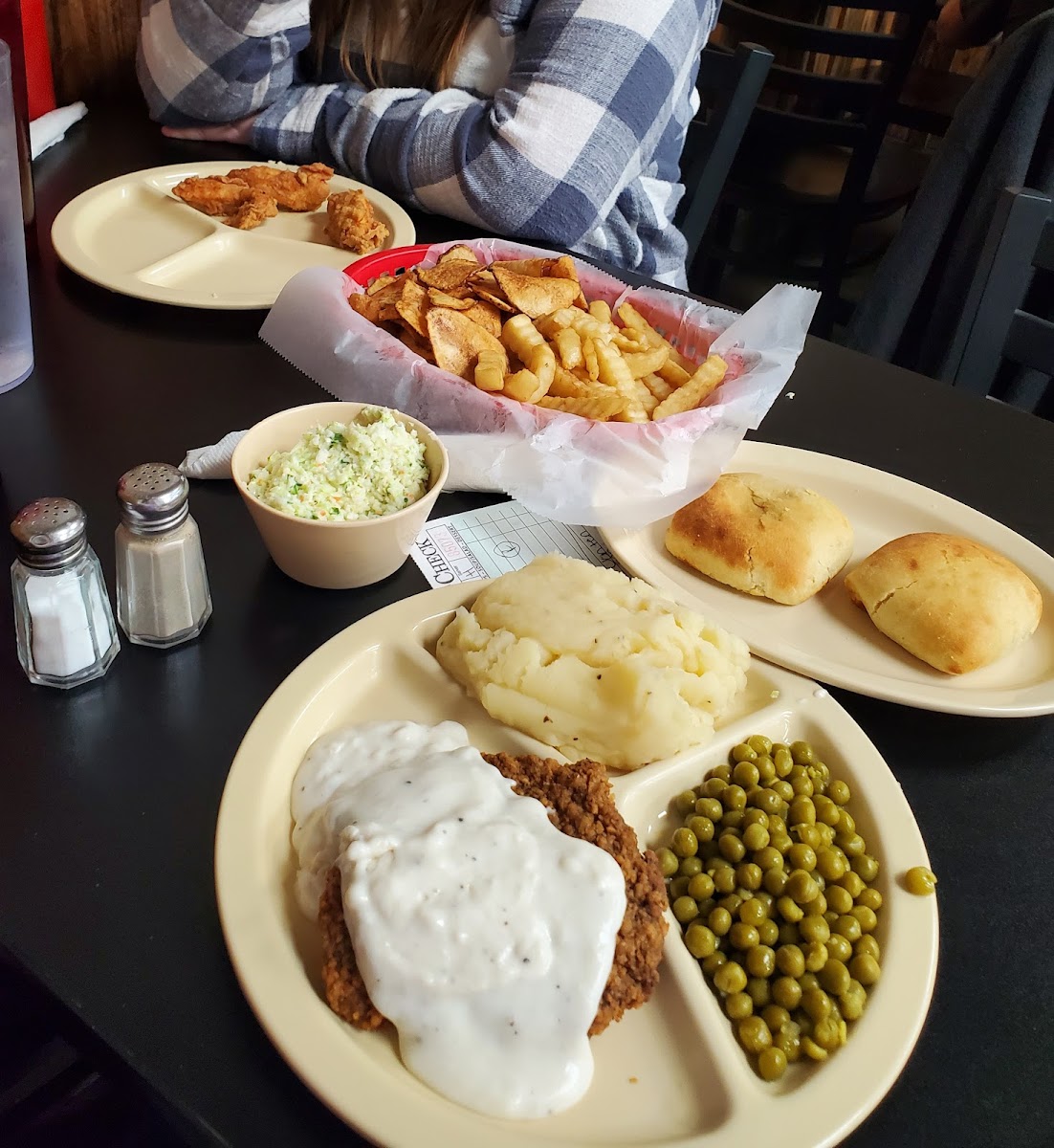 I had the chicken tenders, corn nuggets, mac-cheese. The tenders were a little dry, but good. Come hungry, because the portions are huge. The place isn't very big, so I wouldn't bring a big crowd to eat here. I think I counted 13-14 tables that sit 4 people each. It is a good country for kinda place. The waitresses were very kind and attentive.