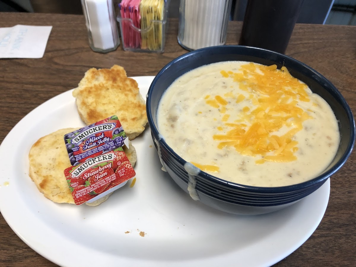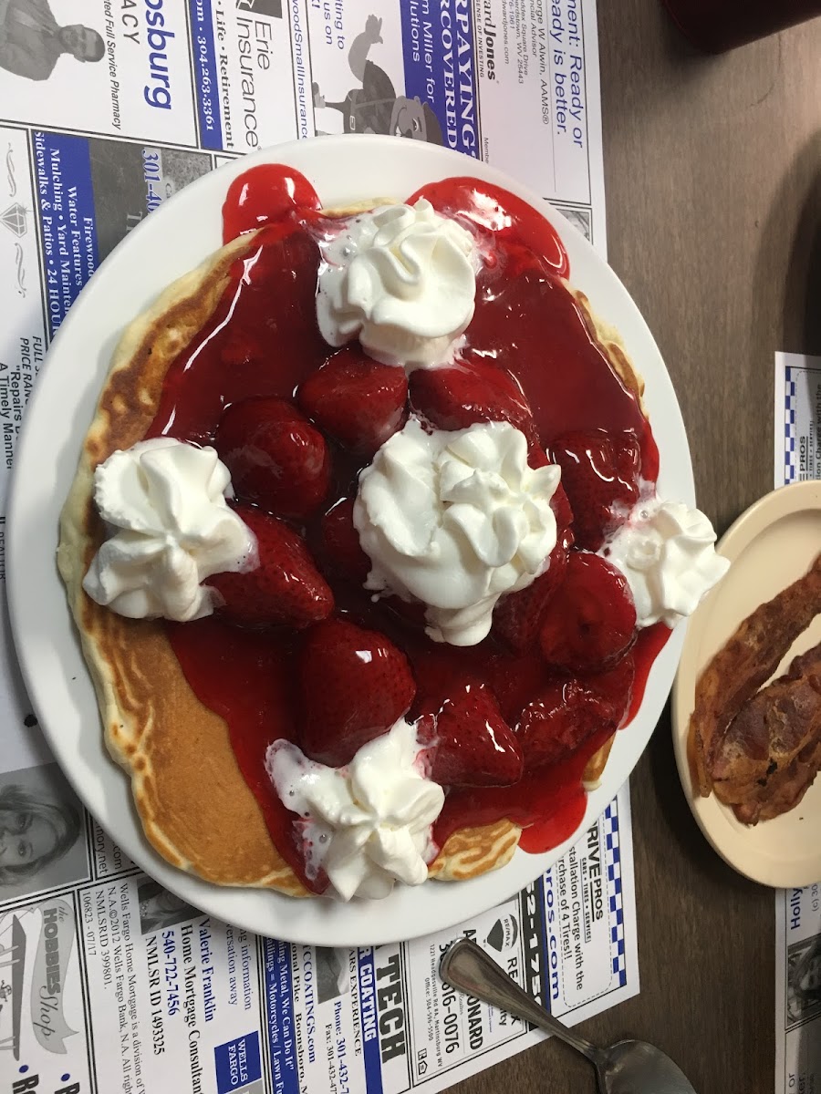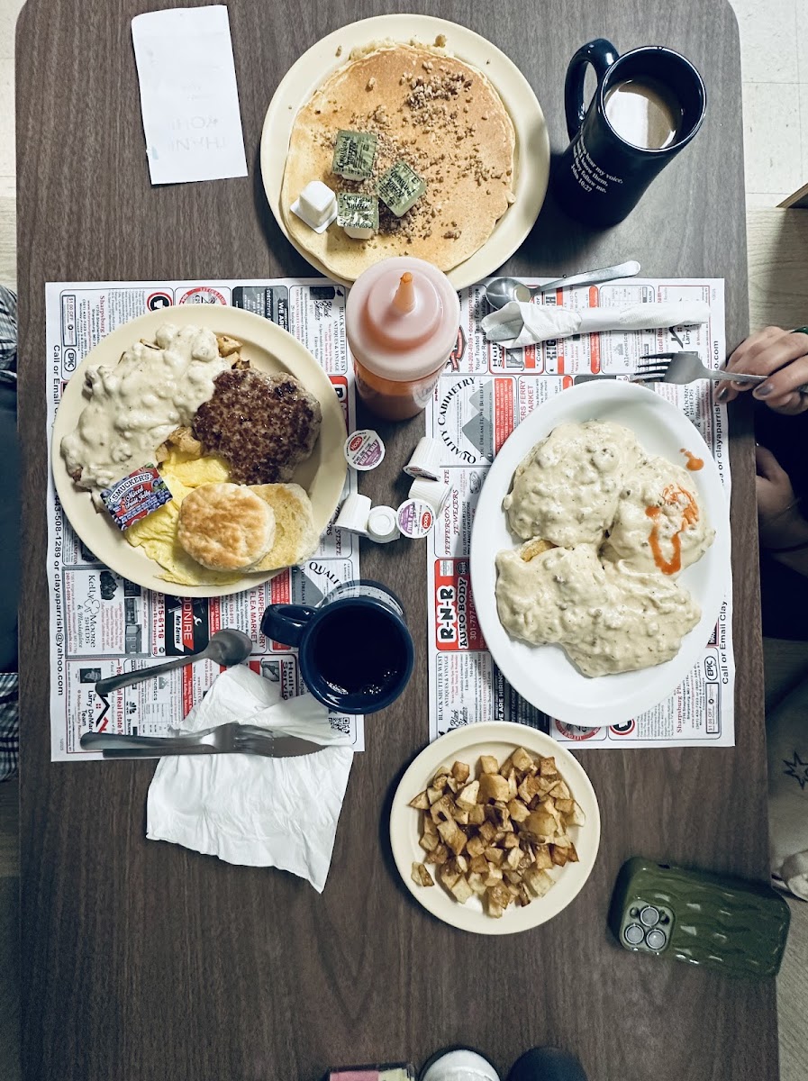 We walked in and it was busy for the holiday weekend but staff was super friendly and sat us shortly after we walked in. It's an older place but a true gem and the food is GREAT. My husband and I are visiting from out of town and read the reviews so decided to stop by and it did not disappoint! The biscuit and sausage gravy is heavenly. The pancakes were bigger than my husband's head. You will leave here full. All of this was only $24, a steal to us! If we visit Sheperdstown again we will be back!