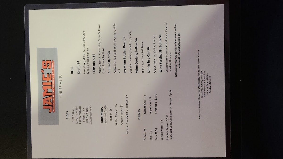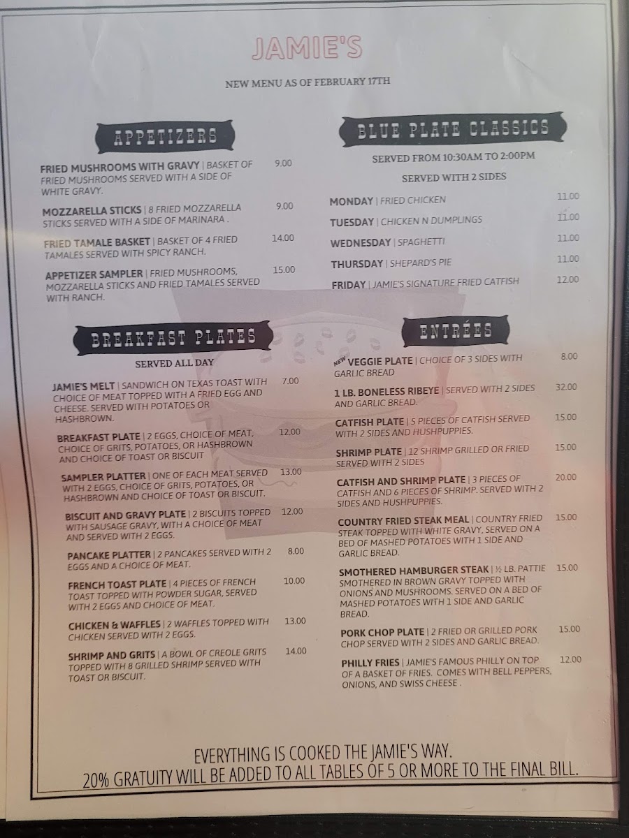 5 pieces of catfish served with 2 sides and hushpuppies.