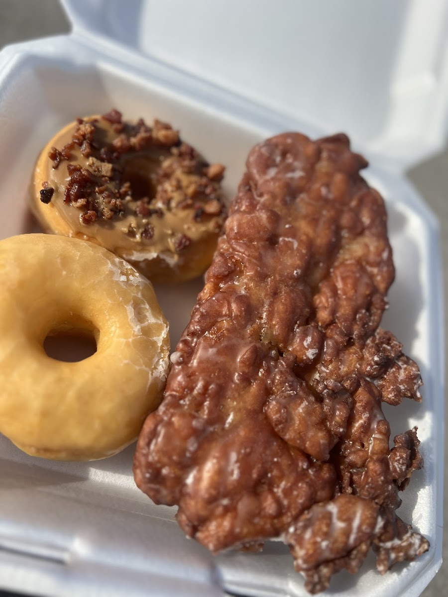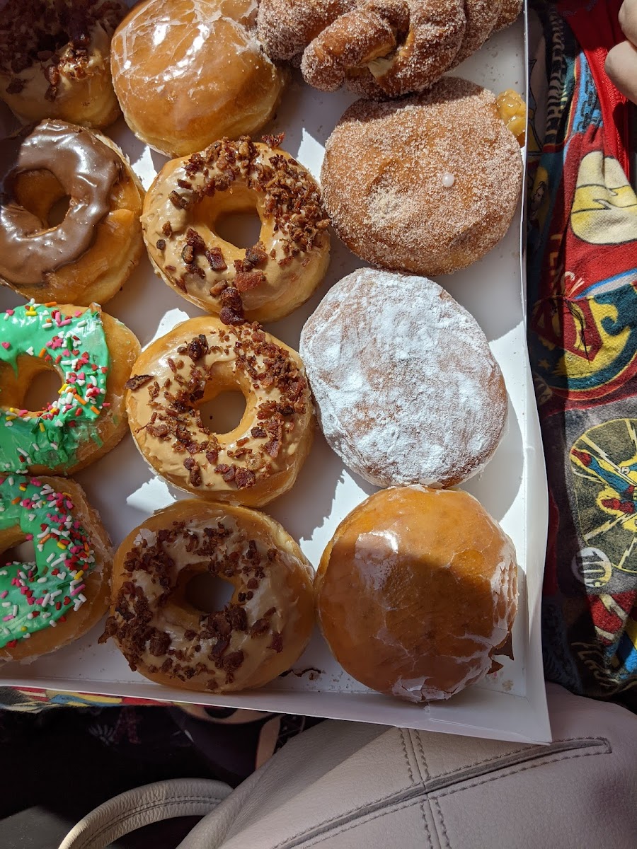 Easy access to get in and out of parking lot. They do have a drive thru or you can go inside. Friendly prompt service. Clean establishment. Donuts are amazing. My favorite is the bacon/maple donut but I can say that everyone i have tried there are delicious. Highly recommend