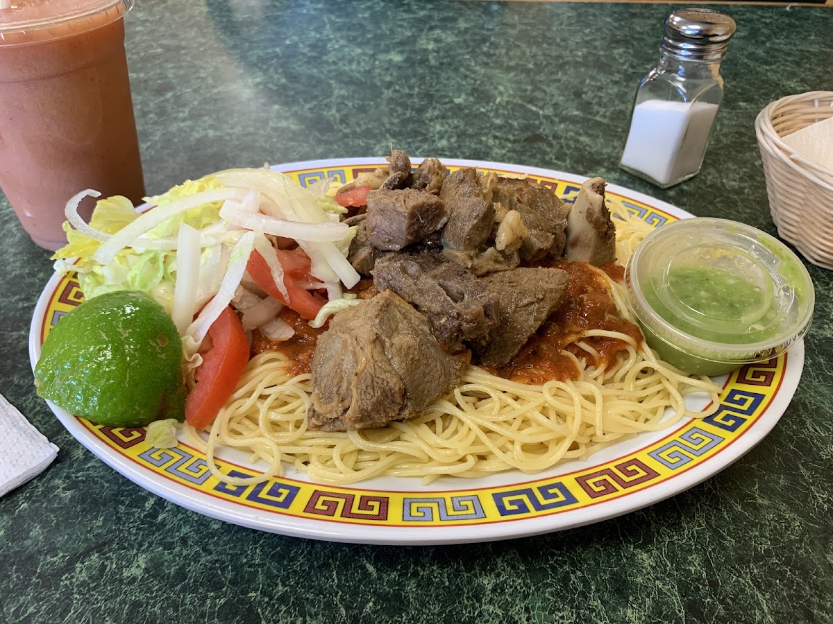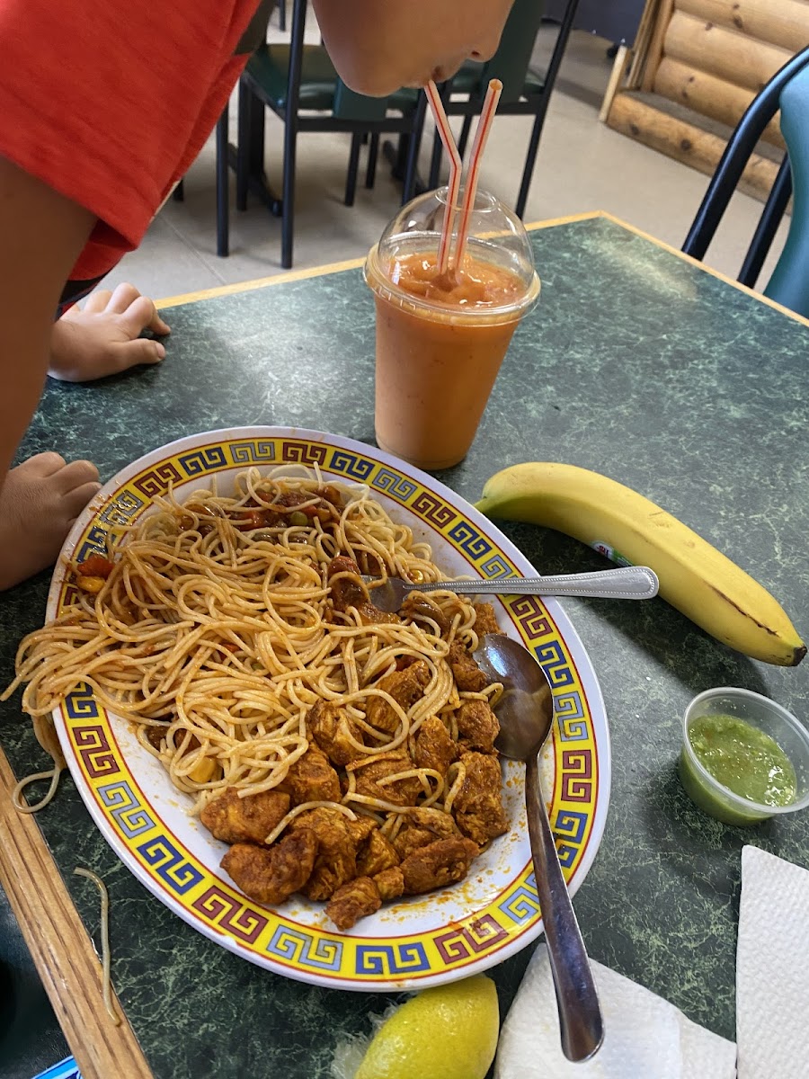Simple atmosphere, everything homemade, delicious! My favorite is the chicken or beef suqar (cubed meat). My son likes the spaghetti which comes with a unique meat and veggie sauce. The smoothies are fresh and made from pure, real fruit. Served with a delicious green salsa on the side. Friendly service. We were traveling through town and could also do our salah there.