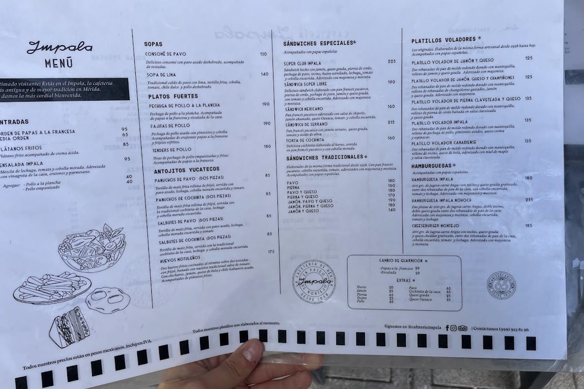 El sándwich más famoso de Cafetería Impala, hecho para los que no se andan con hambre ligera ????. Pan doradito y crujiente, relleno con capas generosas de jamón, queso gouda, pierna de cerdo y pechuga de pavo recién hecha. Lleva tocino bien dorado, huevo estrellado, lechuga fresca, tomate jugoso y cebolla encurtida que equilibra cada bocado ????. Todo va aderezado con mayonesa y mostaza de la casa, cremosa, ligeramente dulce y con ese toque que hace imposible dejarlo a la mitad. Un clásico eterno del Centro de Mérida y Paseo de Montejo, preparado igual que desde 1958: abundante, honesto y con sabor de cafetería real, no turística. Perfecto para acompañar con una malteada o un café refill mientras ves pasar la ciudad ????️☕️