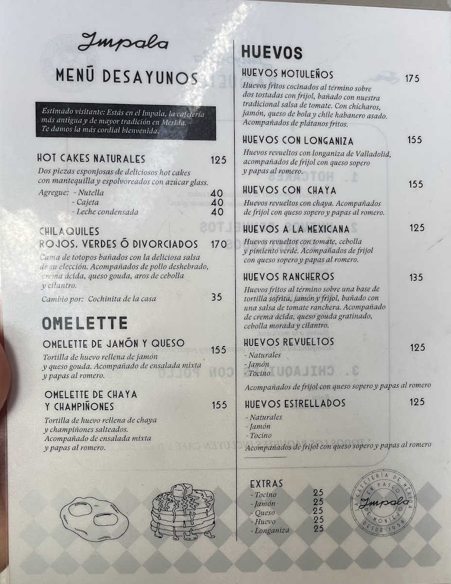 Un clásico yucateco con historia en cada bocado ????. Dos huevos fritos al punto perfecto, servidos sobre tostadas crujientes con frijol refrito, bañados con nuestra tradicional salsa de tomate casera espesa, ligeramente dulce y llena de sabor de hogar. Llevan chícharos, jamón y queso de bola rallado, que se derrite justo al contacto con la salsa ????. Acompañados de plátanos fritos doraditos, como los preparaban las abuelas de Mérida, y servidos con cariño en el corazón de Paseo de Montejo. ✨ Este platillo ha acompañado generaciones en Cafetería Impala, la cafetería más tradicional de Mérida. Perfecto para empezar el día con energía, nostalgia y ese toque auténtico que solo aquí se siente.