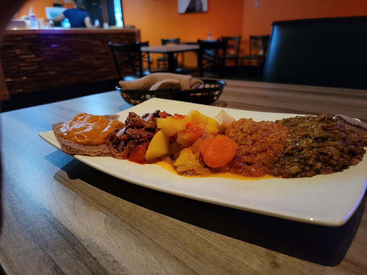 It's a low key cosy family owned restaurant. I went for dinner and felt like it was closed because the lights were dimmed out. It accommodates around 15. Most of them come for a to go I guess. There was a lady and she was the owner and the chef I guess which is what I've seen in the other ethiopian restaurants as well. Anyways, she was nice to us. They didn't have the typical combos but I ordered the vegetarian and added one meat as add-on to it. It was $5 extra. Felt expensive it though. Tastes were good but felt the meat could a bit more softer. The overall experience was not bad. It's value for money I'd say. Can try once I'd return if I don't have options nearby.