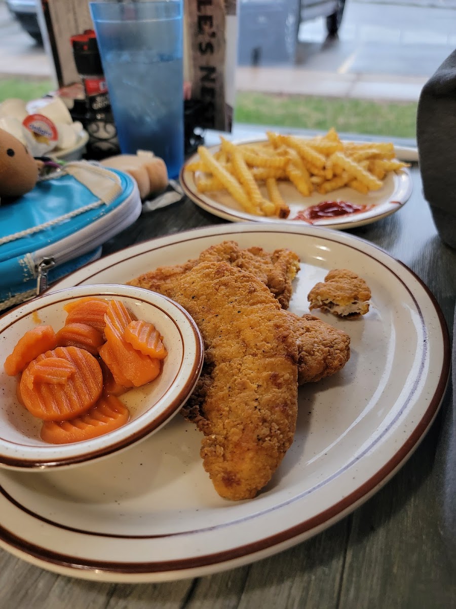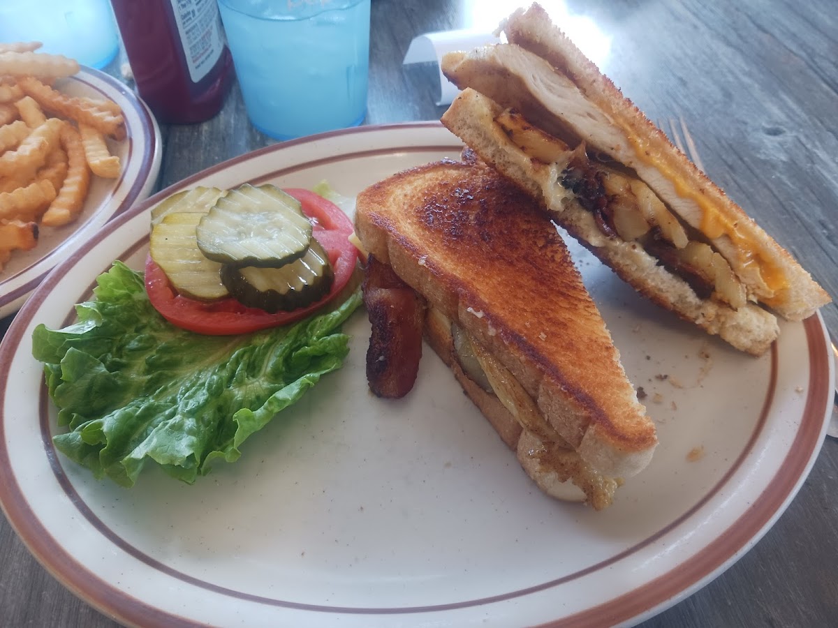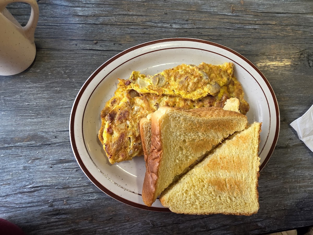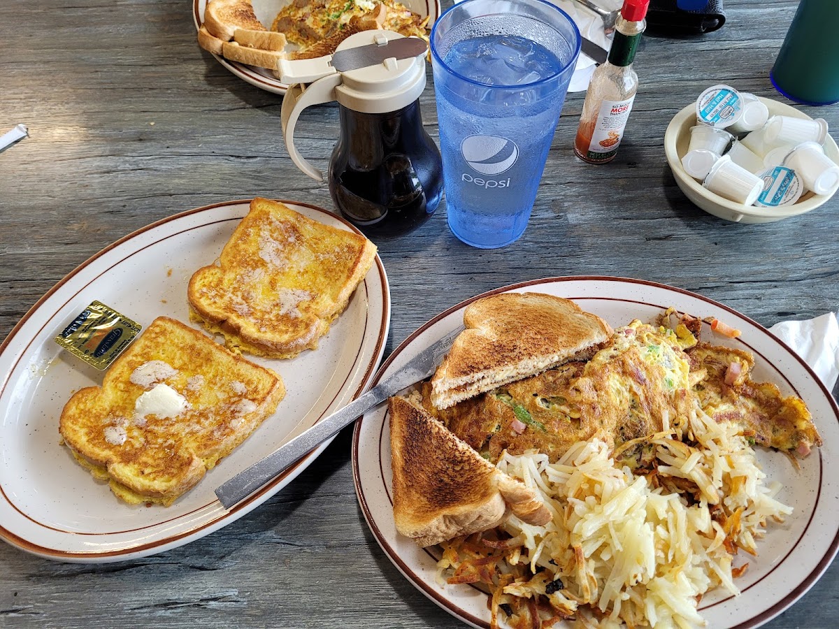 Stopped here for lunch. Service was really good. Created with a smile, got seated right away. Ordered a hamburger with soup of the day, added fries for a $1. Ordered a bacon, sausage, onions and american cheese with texas toast and a hot chocolate. Our waitress was very friendly and checked on us often.