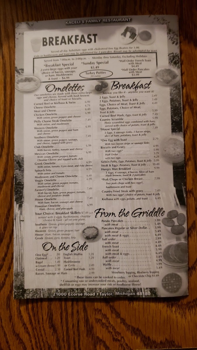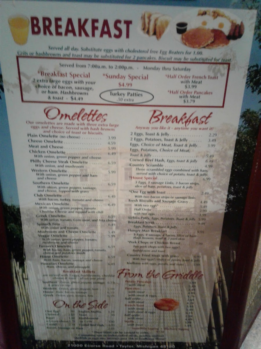 3 eggs, 2 sausage links, 2 bacon strips, slice of ham, potatoes, toast, & jelly.