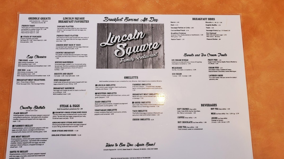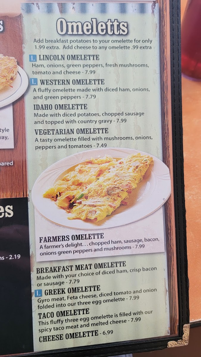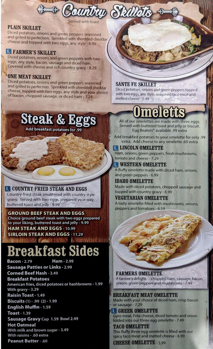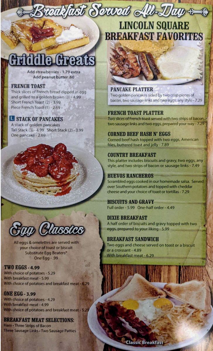 One egg, choice of potatoes and breakfast meat. Options include assorted toasts, American fries, diced or hashbrown potatoes, and a variety of meats. Eggs prepared to preference.