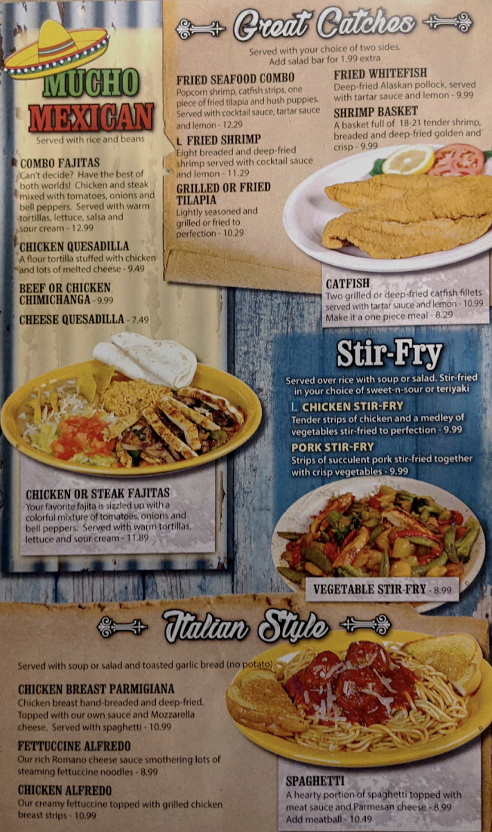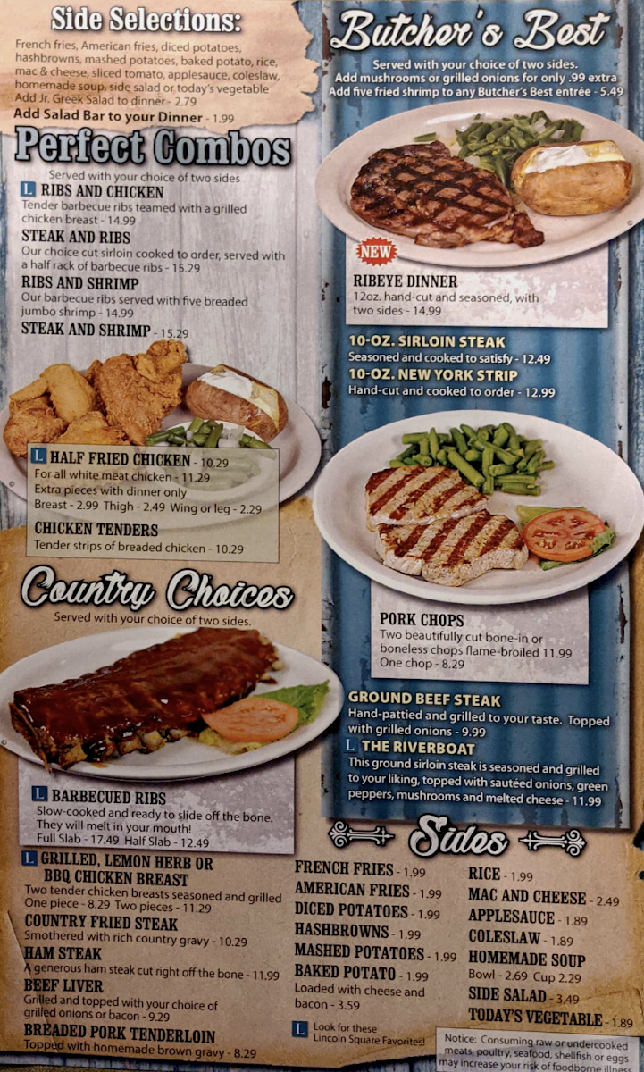 Steak paired with shrimp, choice of steak preparation. Selection of two sides from fries, potatoes, rice, mac & cheese, salads, or vegetables.