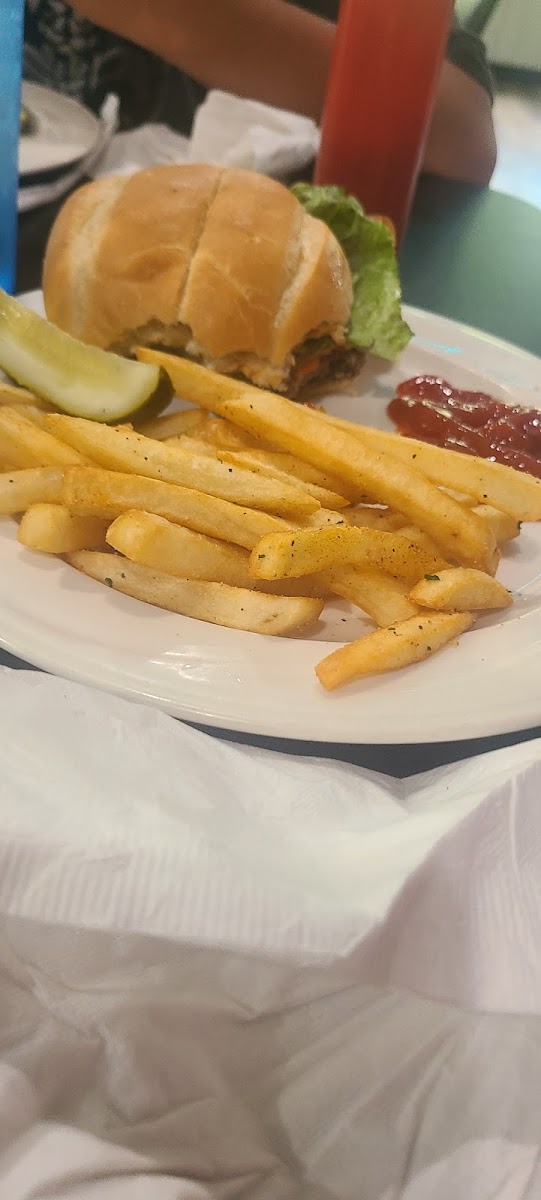 First time here. The food was good. The service was good. It was clean and our waitress was friendly. There is a game shelf with things for the kids to do. A jukebox. Cons...my daughter couldn't get a chicken wrap because it was dinner not lunch. My son ordered a baked potato. Waitress came out said they weren't available. Whenever anyone came in or out of the kitchen the door slammed. That was not relaxing!