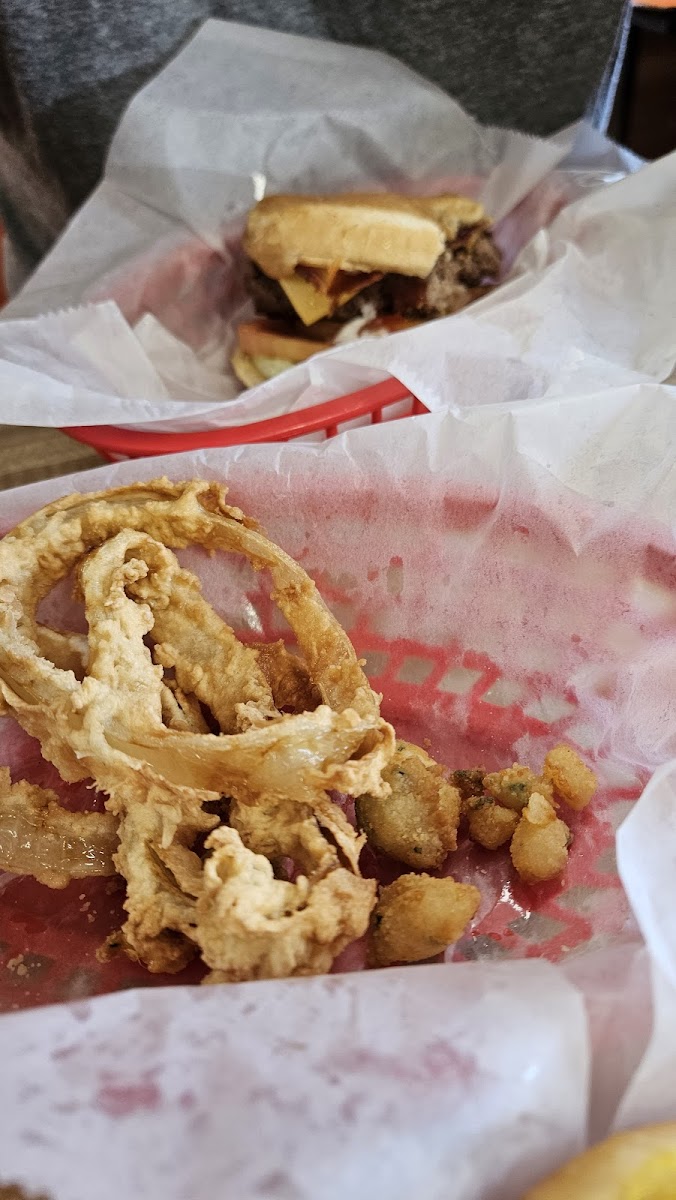 Excellent service, amazing food! Our group had cheeseburgers, bacon cheeseburgers, the po' boy, shrimp tacos, onion rings and cheese curds. All of it was really good, fresh, homemade food! Burgers, onion rings and curds were exceptional!