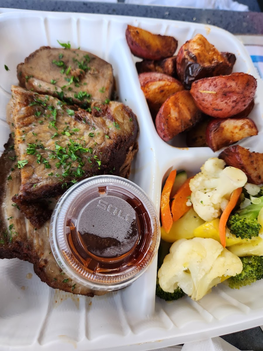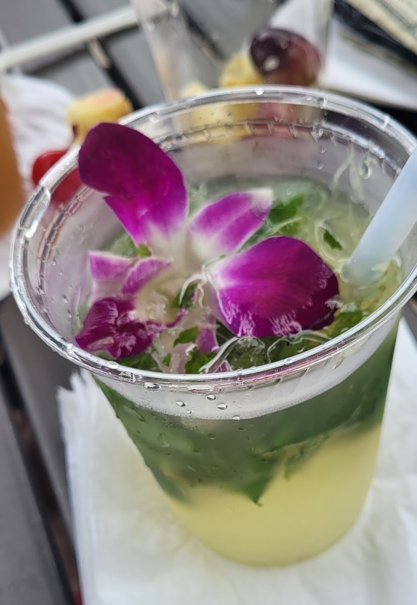 We had the BBQ pulled pork with coleslaw, fries and a drink. It was so delicious, flavorful and enought for 2 to share for $15.75. Outside seating
