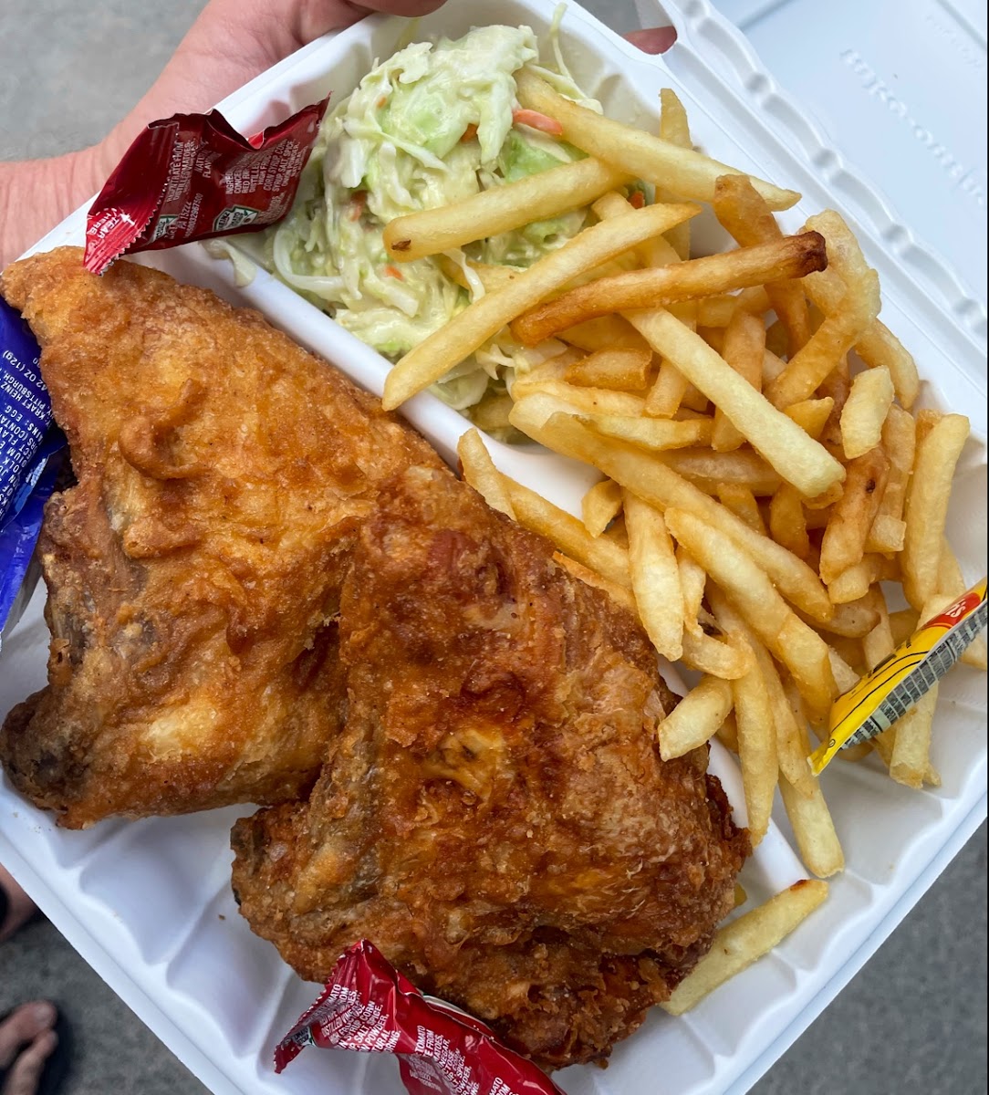 My meal was amazing I got the cheeseburger fish sandwich was okay and pulled pork sandwich was so so salad was great and coleslaw was bland but the worker were super nice and efficient because it was lunch rush and the atmosphere was what you would expect but still good.