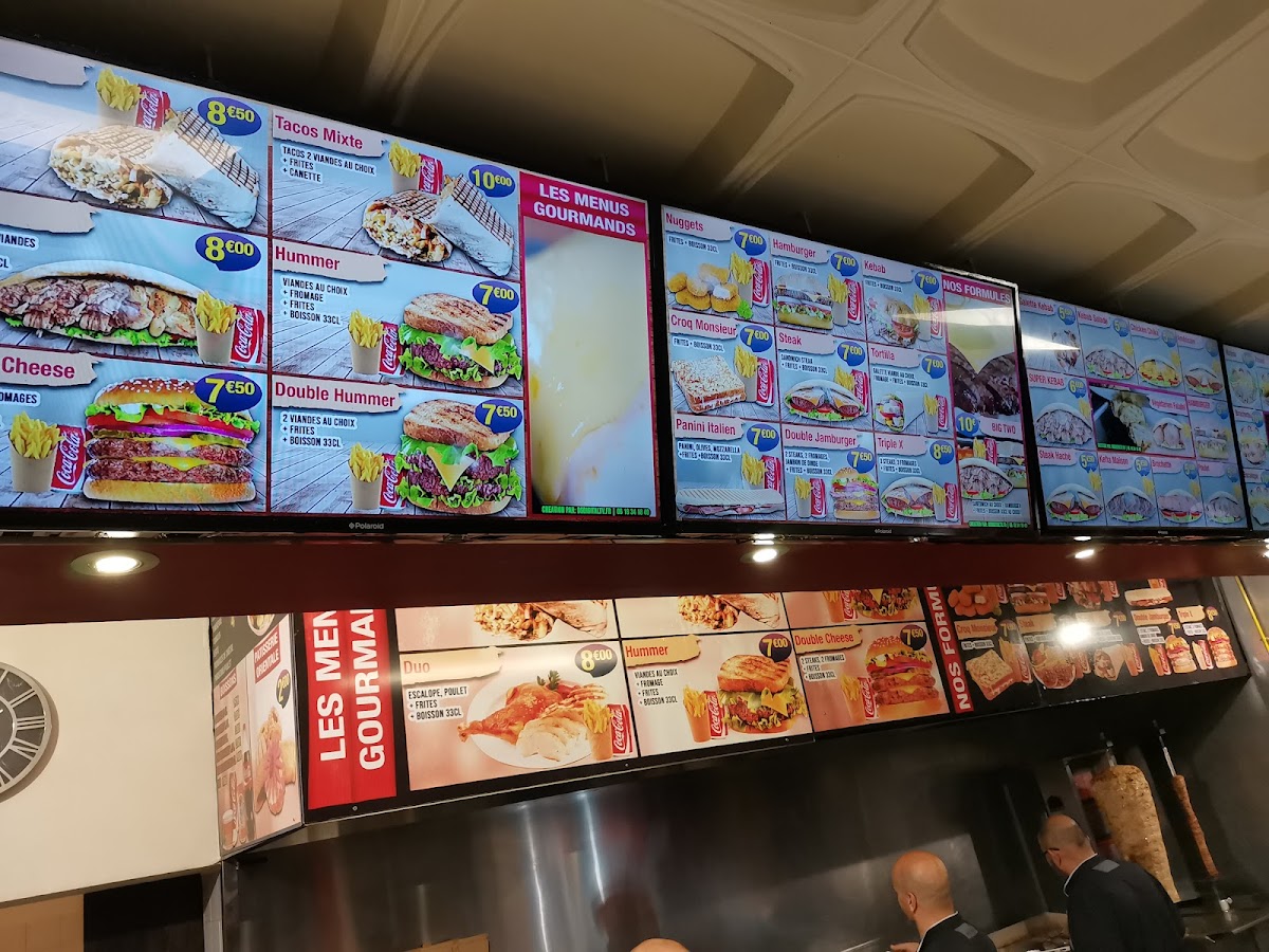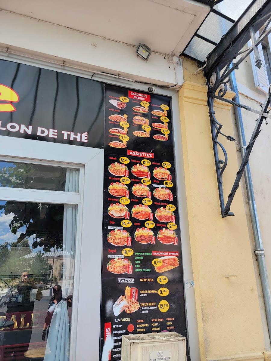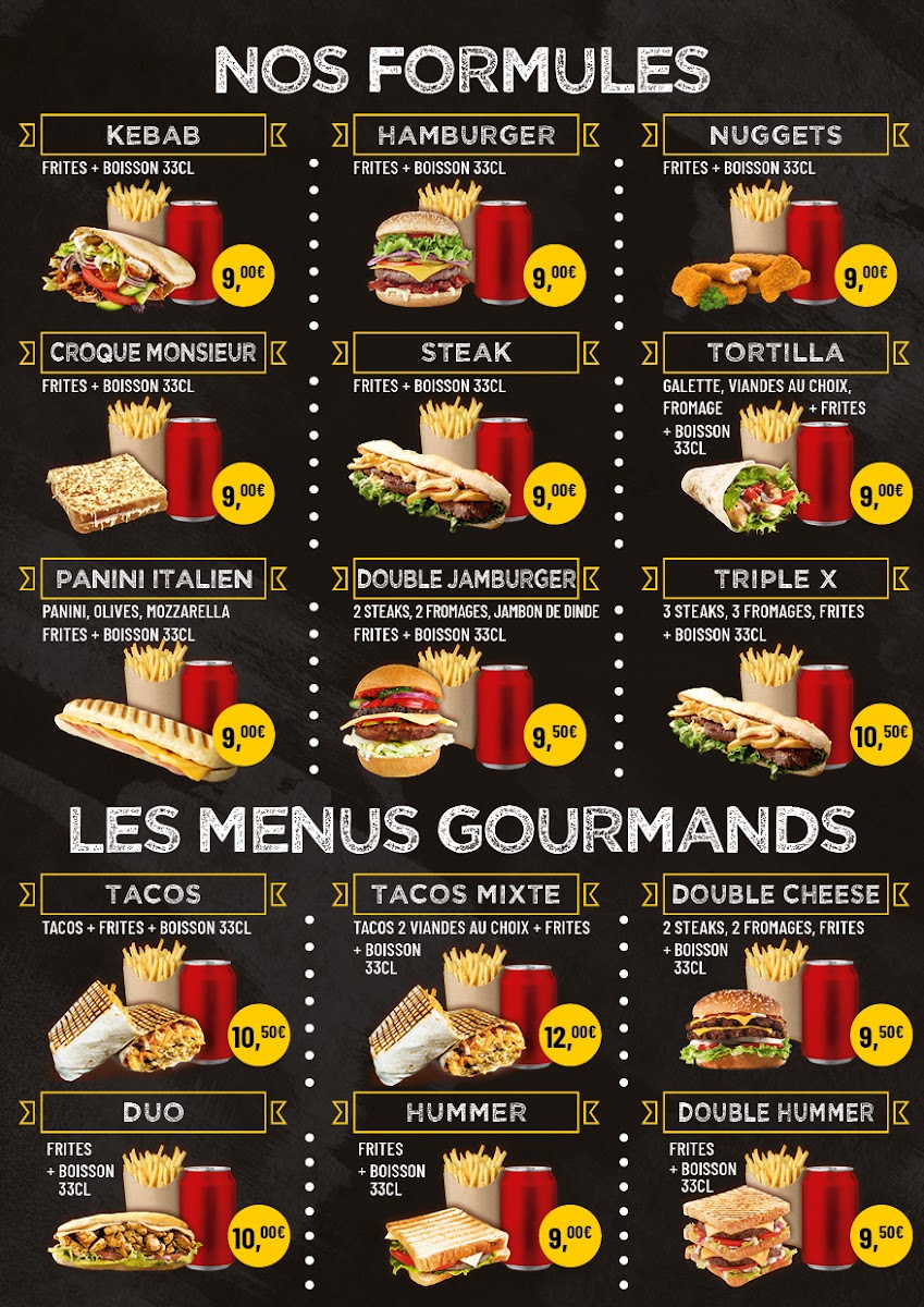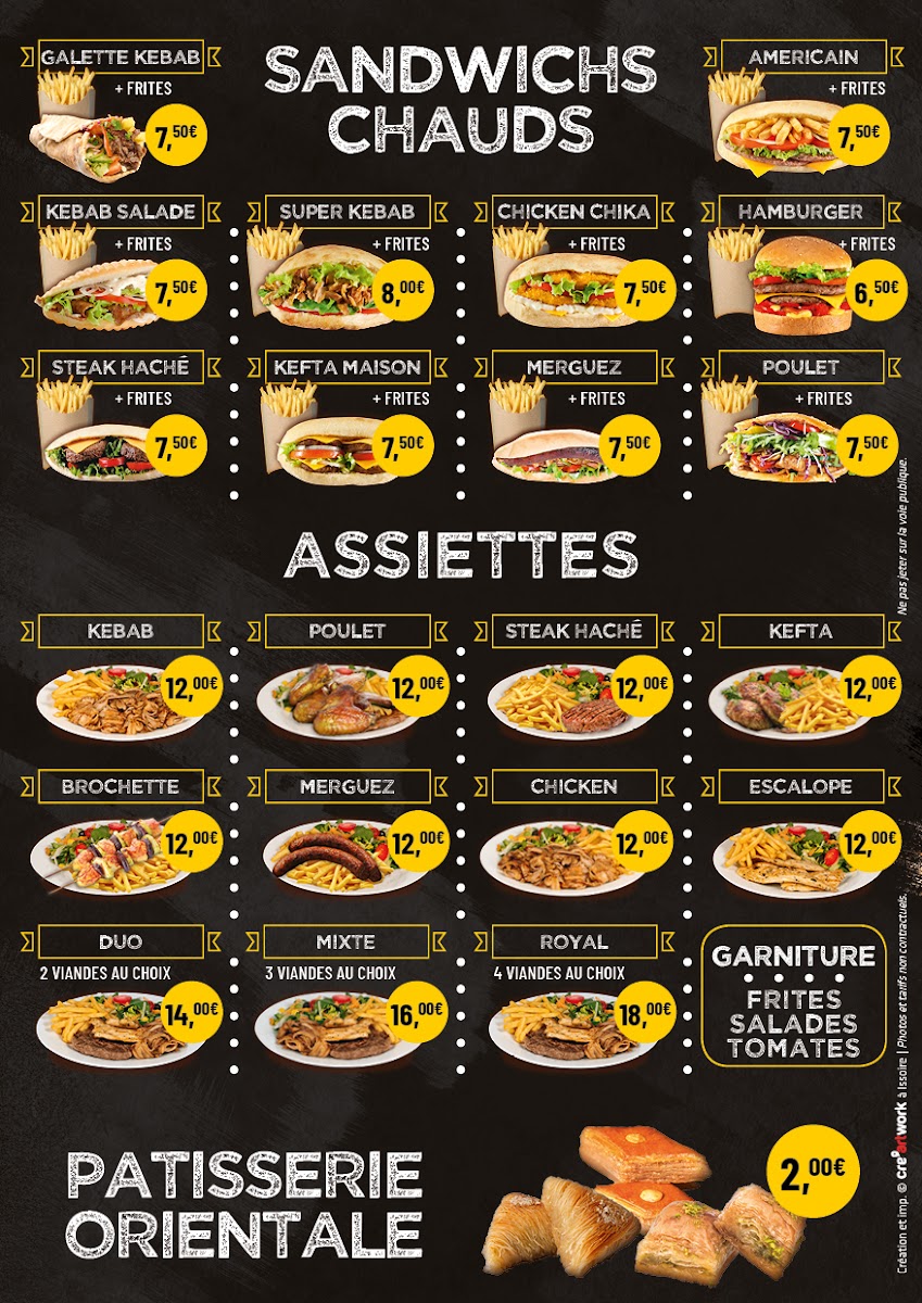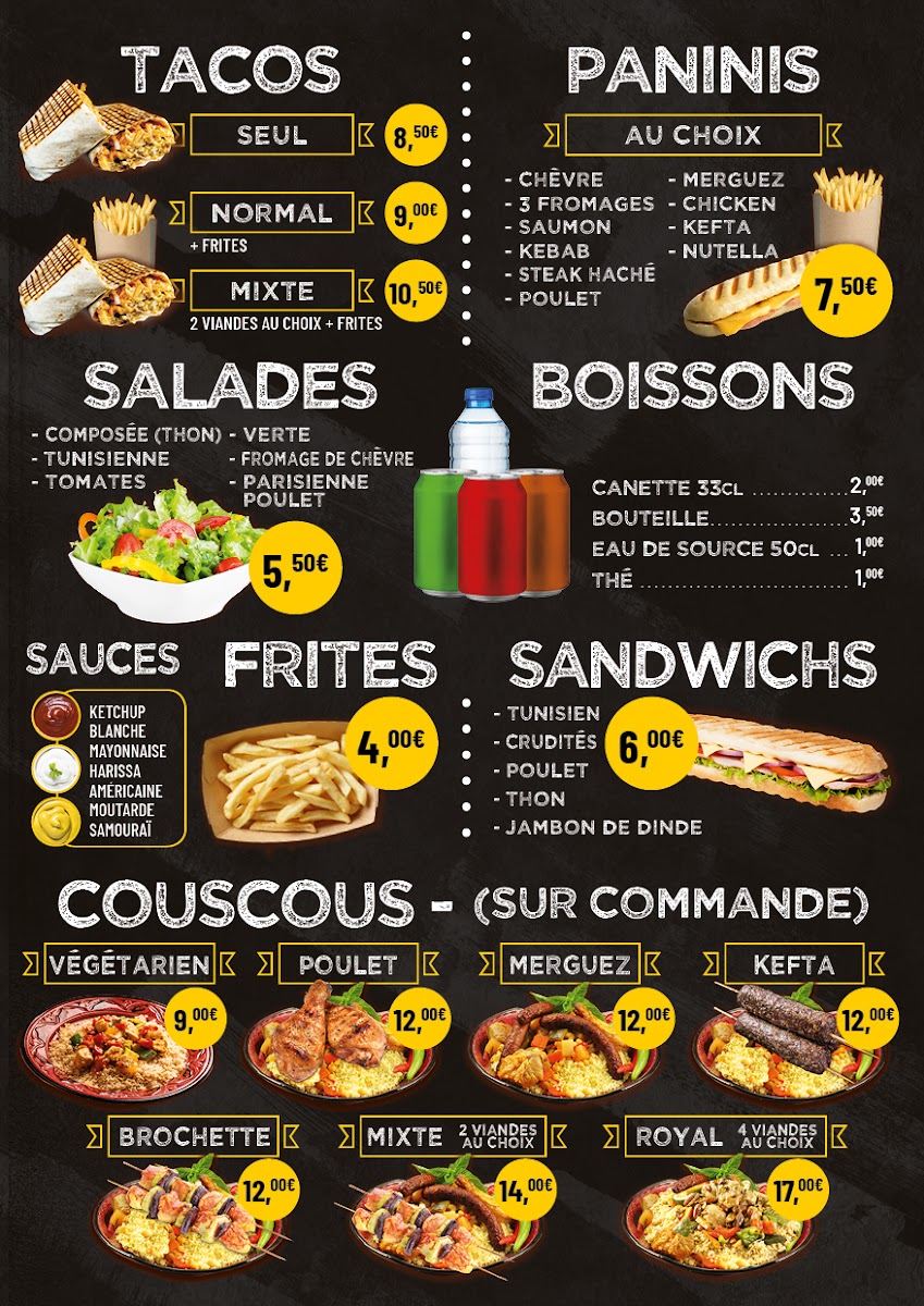 Sauces : - Ketchup - Blanche - Mayonnaise - Harissa - Américaine - Moutarde - Samouraï