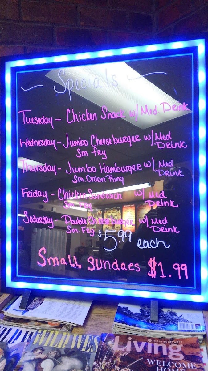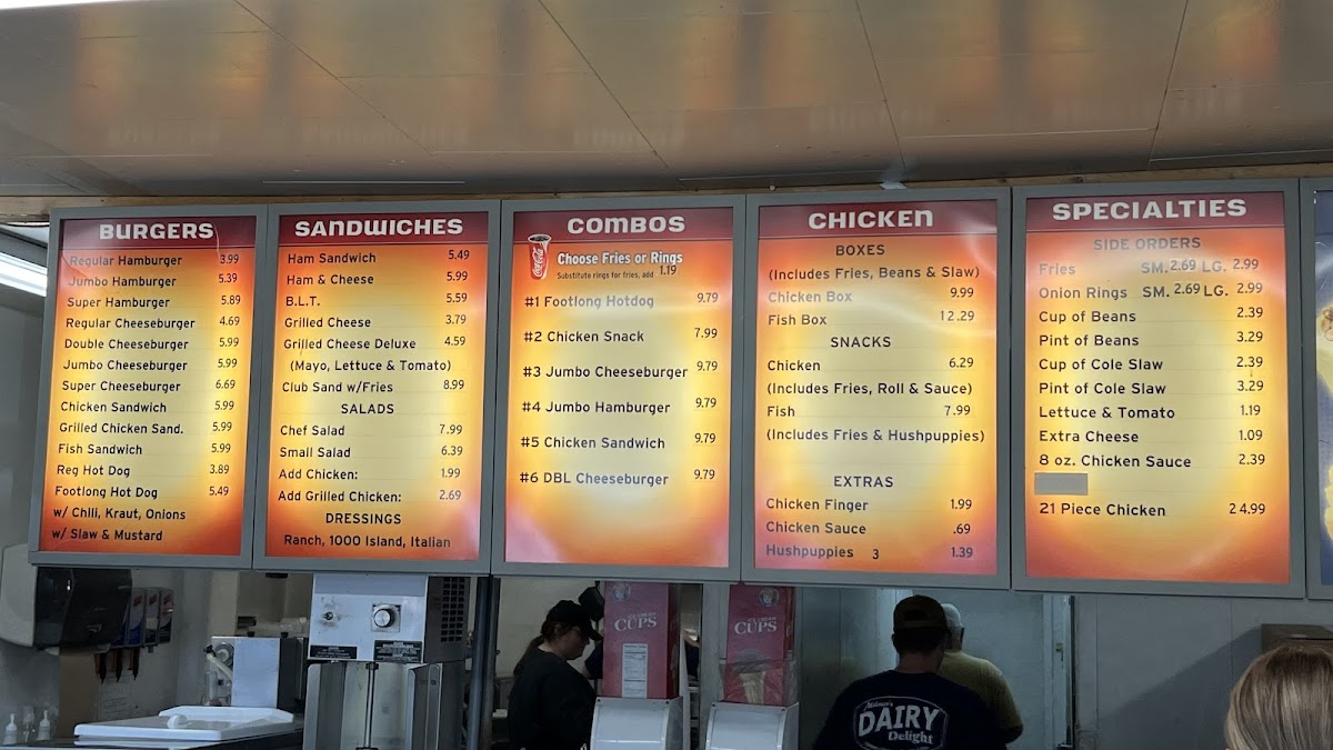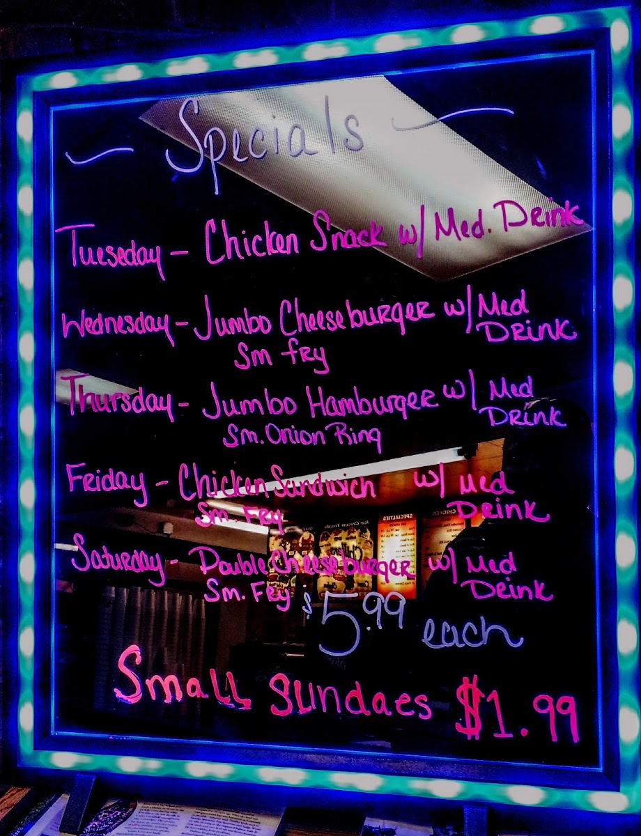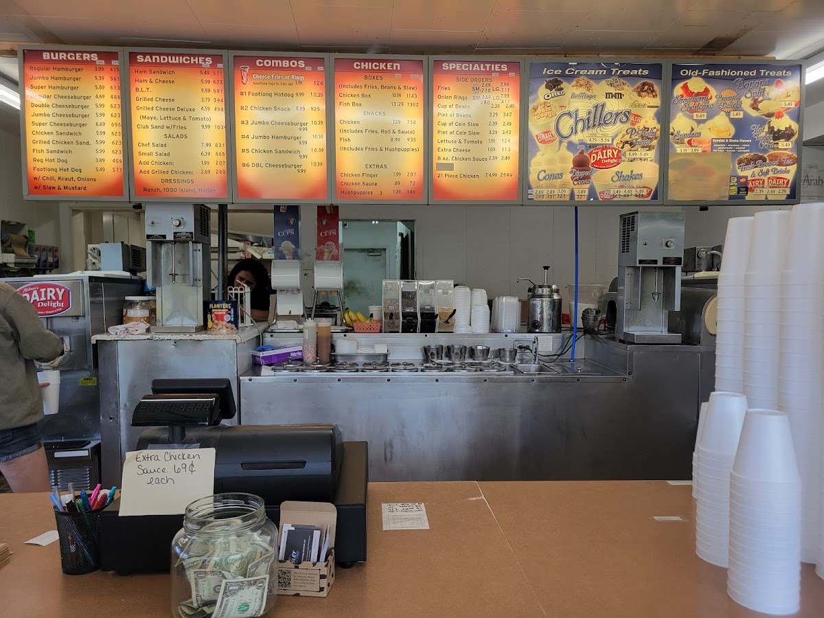 Jumbo Hamburger comes with mustard, ketchup, pickle, and onion. Served with fries or onion rings for only .99 cents more.