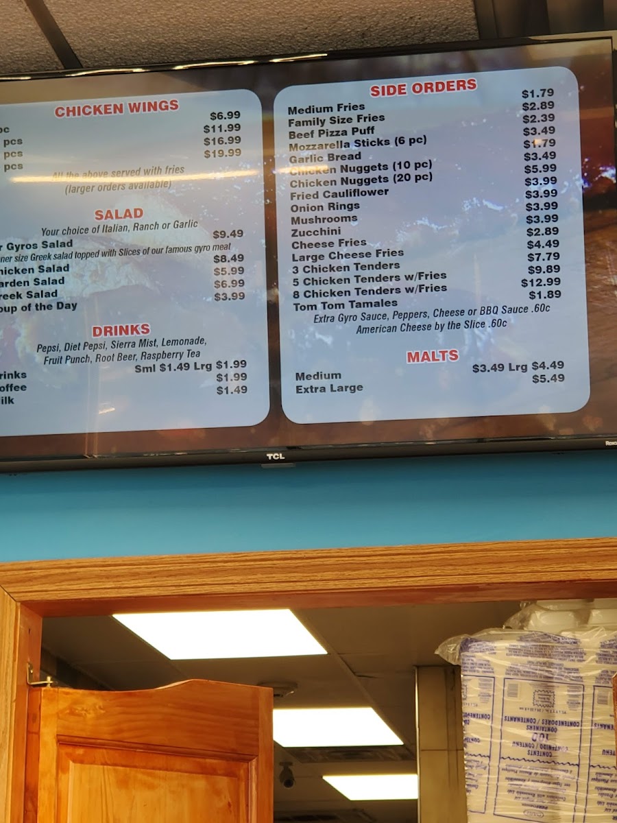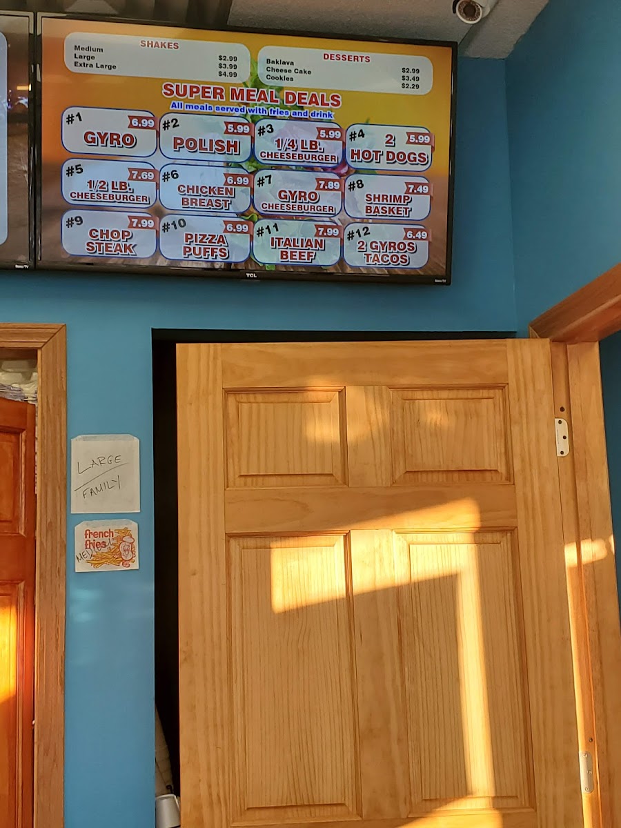 Served with a small Greek salad, french fries, three pitas and sauce