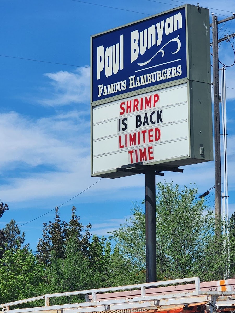 My husband and I are from this area and moved to Boise in 2013. We visit rarely but everytime we come to this area we HAVE to get a paul bunyan burger. There is nothing like a paul bunyan burger in our eyes the taste is a very unique amazing flavor that for some reason only they have. We have searched high and low all over Boise for an amazing burger but nothing compares to the holy grail. The Onion rings are real onion layers that are amazing! Hard to find. Paul bunyan just knows what the people want! If you ever come here and want the best burger ever this is the place to go! Now I just have to figure out how to get them to build a location in Boise!