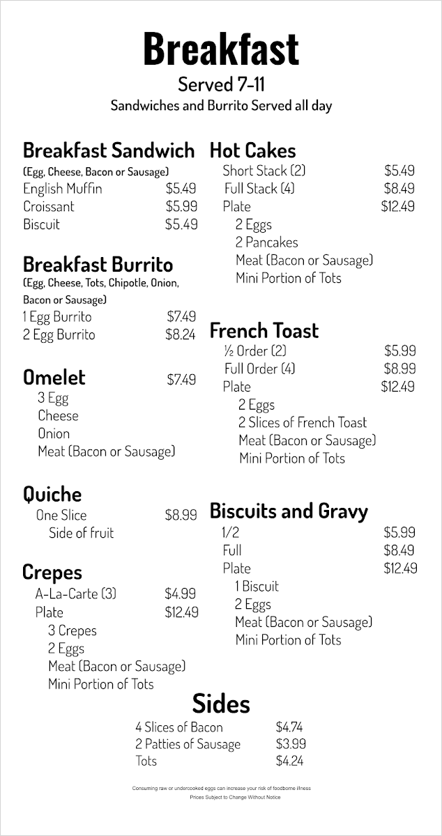 -Fried Egg -Cheese -Meat (bacon or sausage)