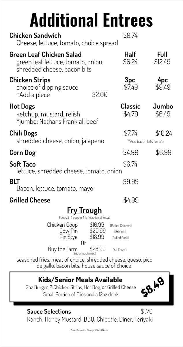 burger, grilled cheese, hot dog, (2) chicken strips