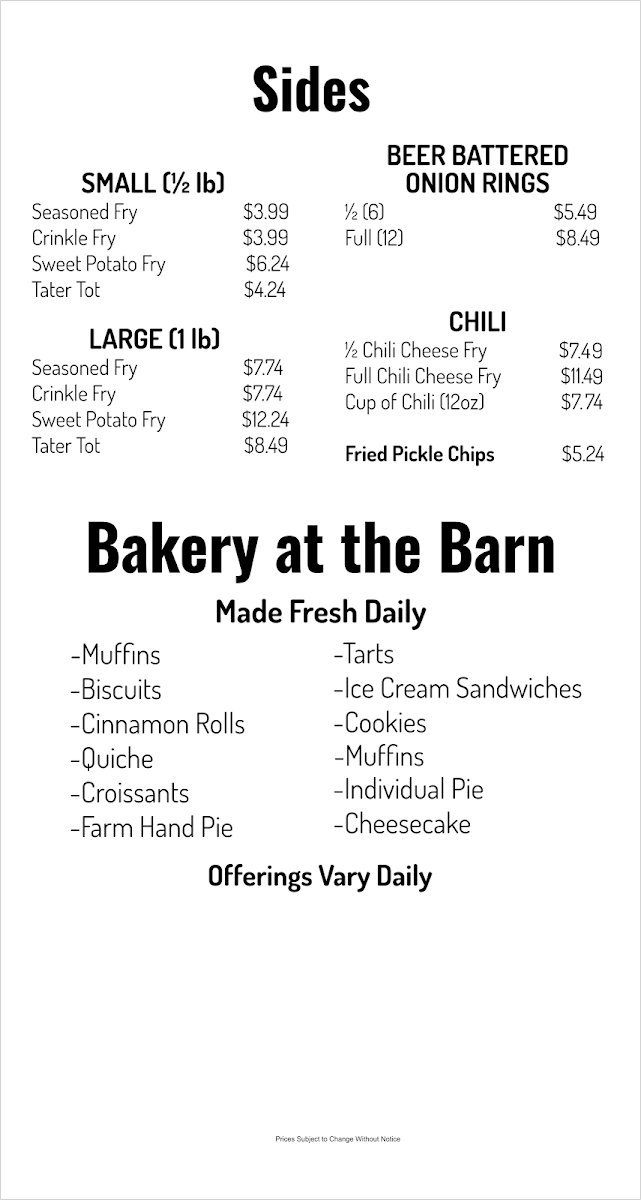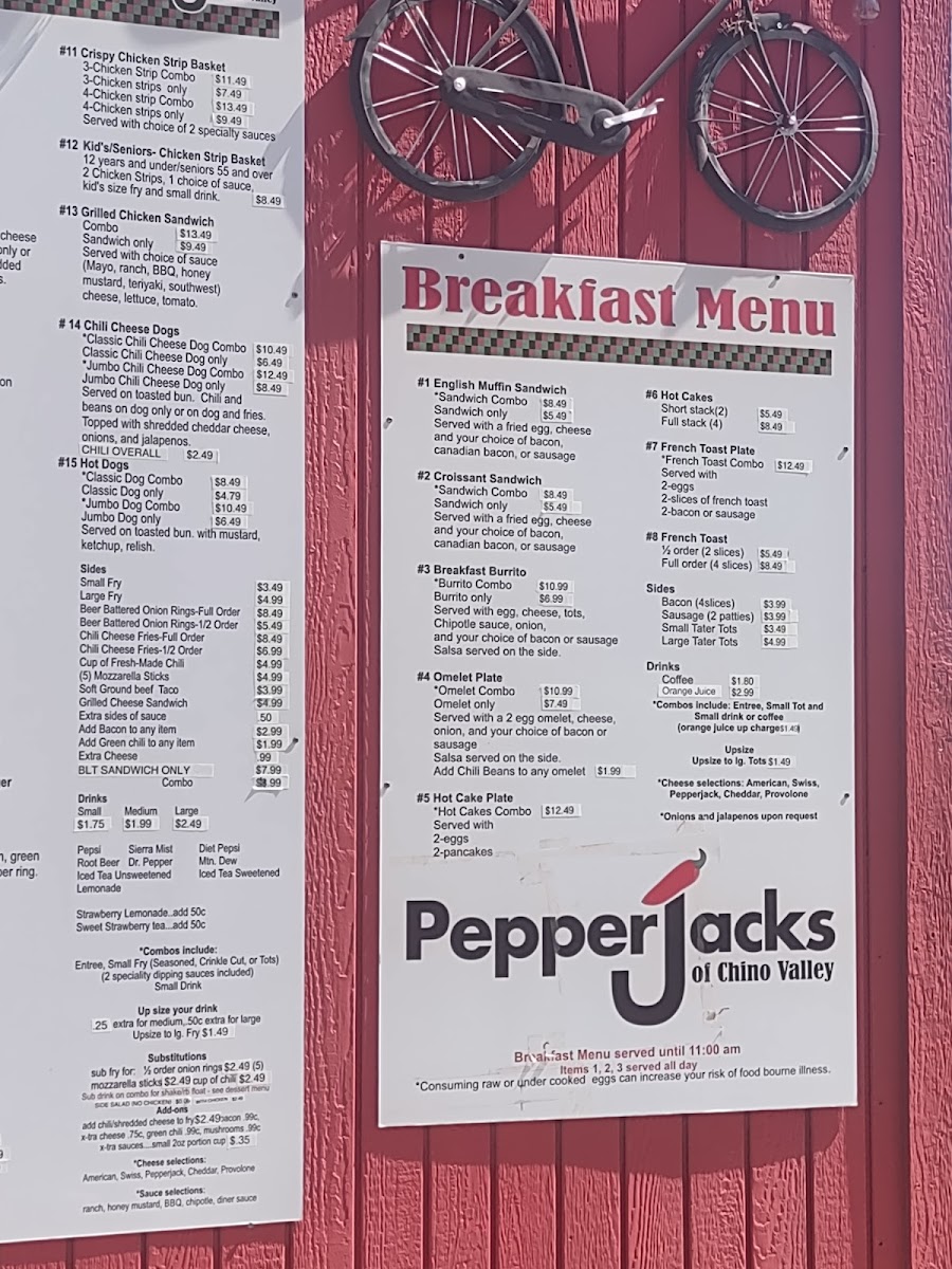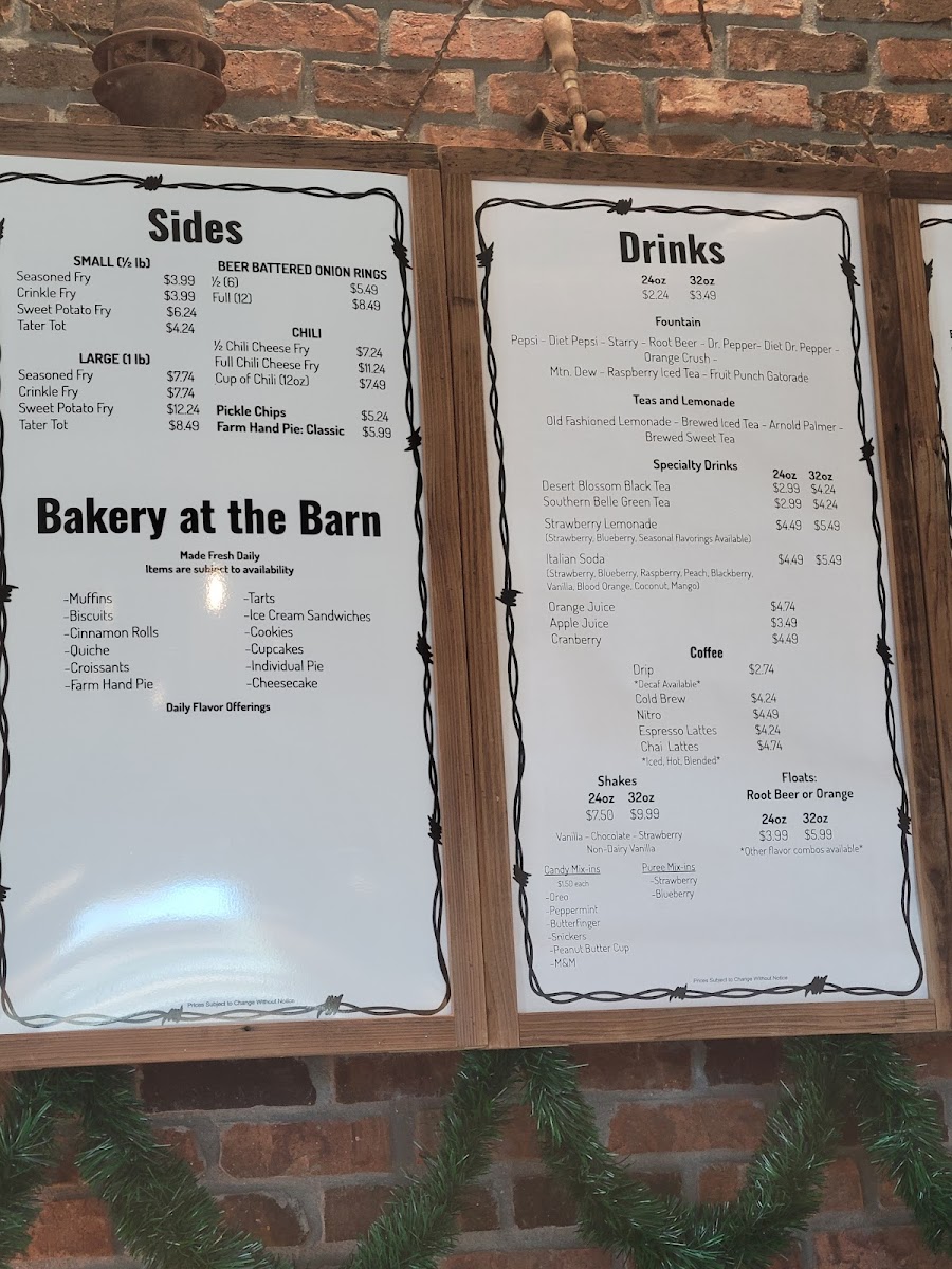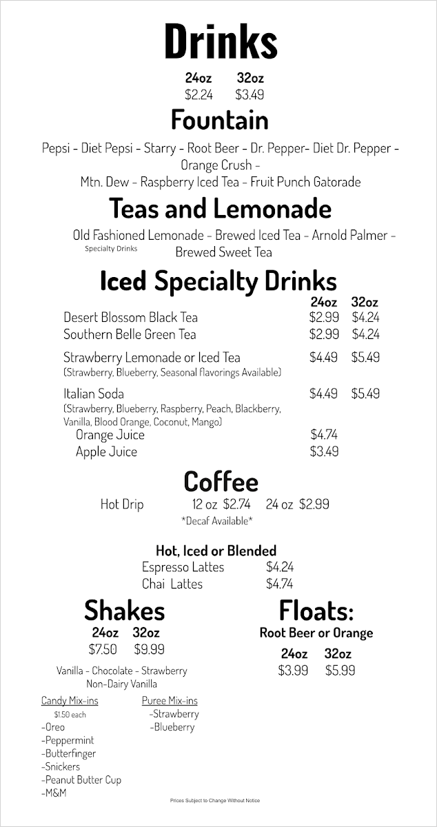 Pepsi - Diet Pepsi - Sierra Mist - Root Beer - Dr. Pepper - Mtn. Dew - Rasberry Ice Tea - Lime Gatorade - Old Fashion Lemonade - Brewed Ice Tea - Brewed Sweet Tea