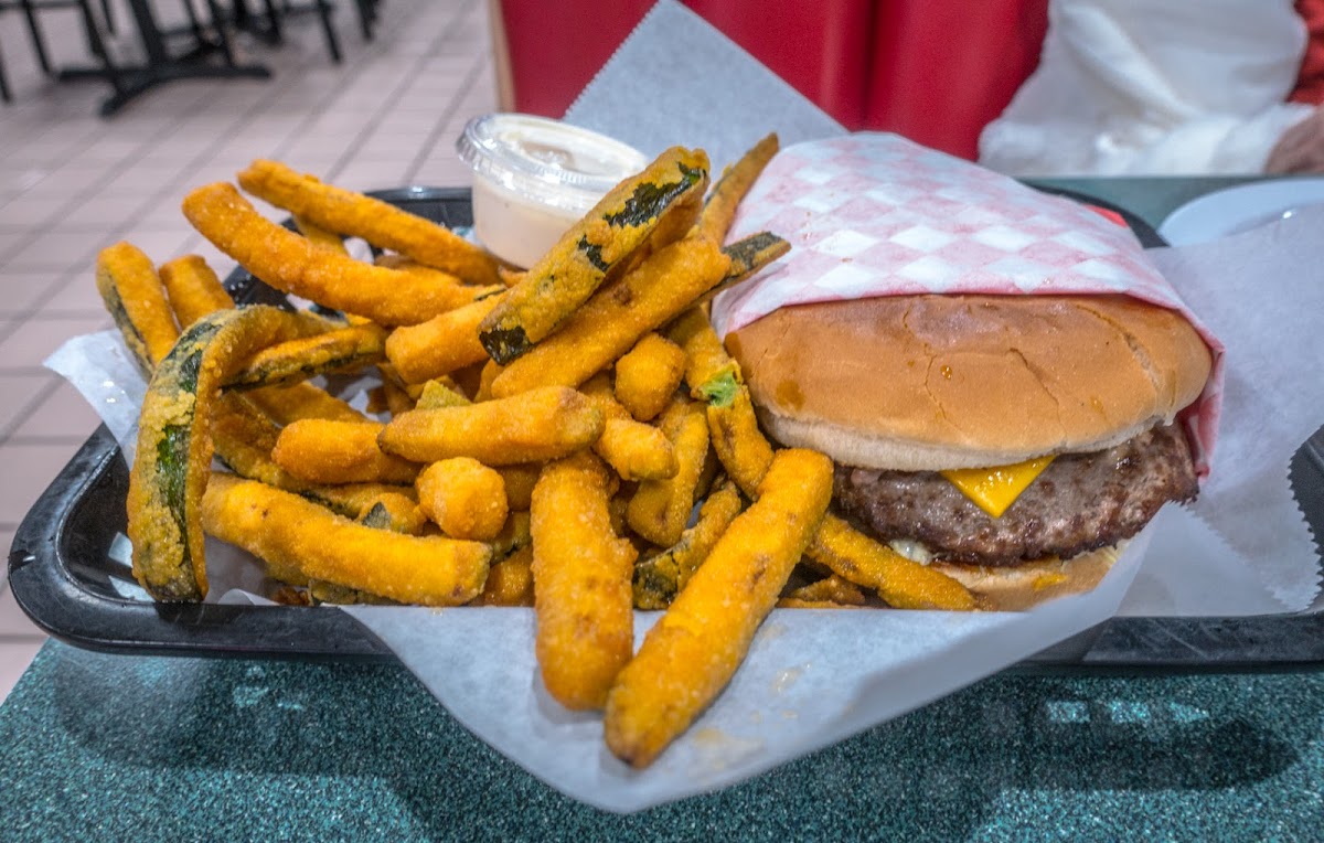 I went in and got the 10$ combo of burgers , fries and chicken tenders . This place is a really good all around quanitiy and quality good . The chicken tenders were moist inside and crispy outside and the fries were fat and crispy. The burger was a little lacking but their honey mustard sauce made it up by being amazing and the workers whom I asked to make my order to go were nice. The police officer outside flirting with the drive through worker with both of their speakers blasted in the parking lot really caught me off guard though.