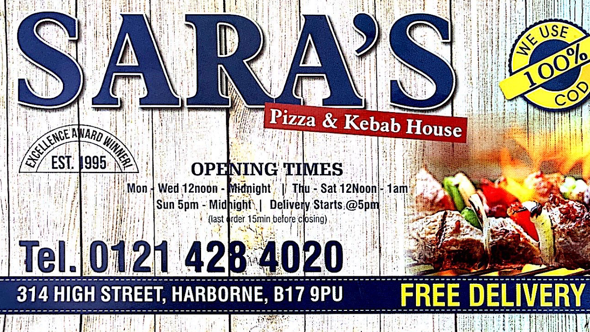 Sara's Kebab House is a fast food restaurant located at 314 High St, Harborne, Birmingham, UK. It has accumulated 344 user reviews. Peak wait times reach up to 30 minutes on Monday evenings between 6:00 PM and 8:00 PM, and shorter waits of up to 15 minutes occur on Tuesday, Wednesday, Saturday, and Sunday evenings. Thursday and Friday typically see no wait times. The menu features popular items such as Chicken Tikka Skewers, Mix Donner Kebab, Chicken Tikka Naan, a Cheese Burger with Chips and Drink Meal priced at £6.00, and Shish Kebab, catering to quick, flavorful meal options.