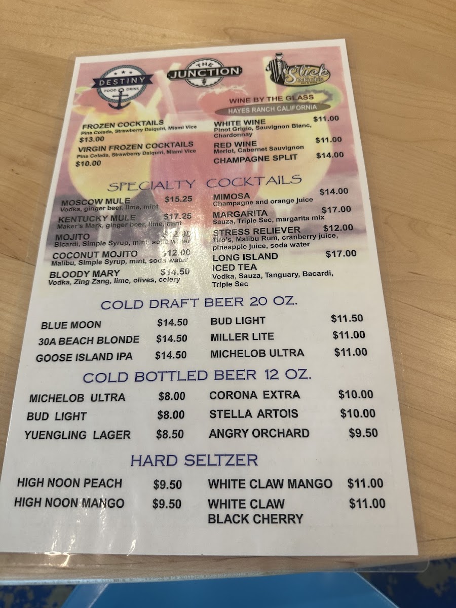 The Junction Vps is a fast food restaurant located at 1701 FL-85, Eglin AFB, FL 32542, United States. With 6 reviews, the menu features drinks such as High Noon Mango, White Claw Mango, High Noon Peach, Angry Orchard, and Yuengling Lager. Customers benefit from no wait times throughout the week, ensuring quick service.