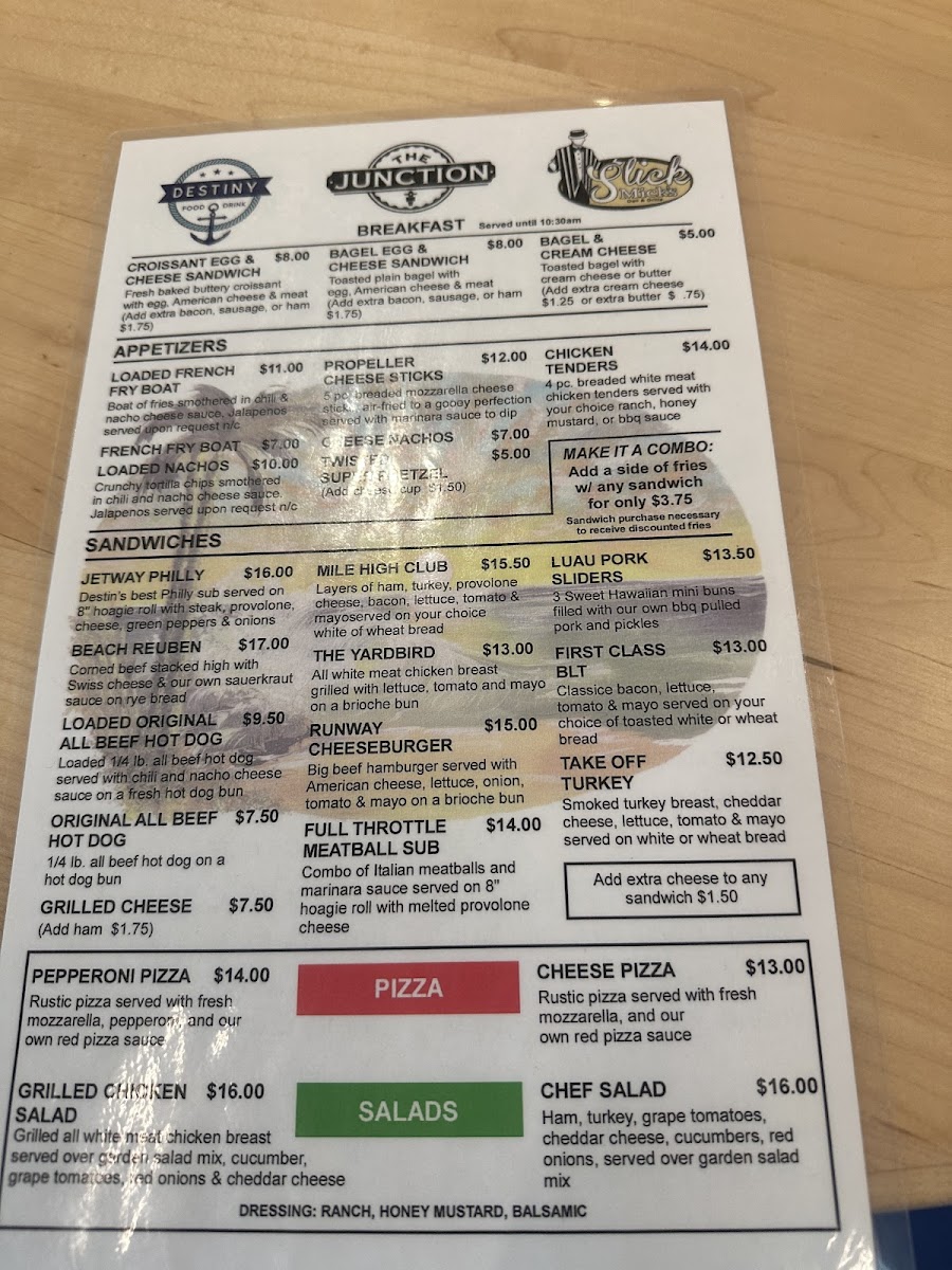 Great place to eat when traveling! I suggest the Mile High Club sandwich..and grab something from Destiny bar next door...