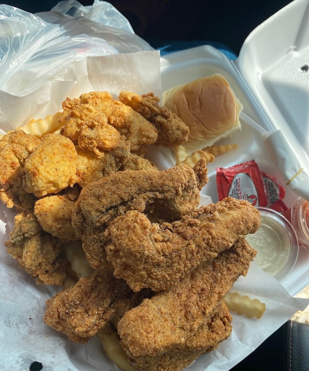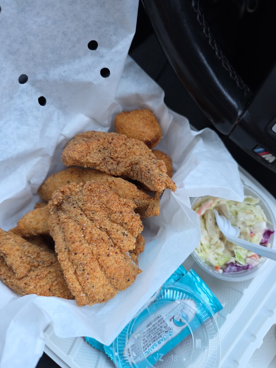 We got fried whiting and tilapia with shrimp and fries, the fish were a little tough from being over done but tasty! The shrimp were perfect and delicious. The macaroni salad was good too. The homemade tartar sauce was amazing! I mixed mine with the hot sauce highly recommend it!