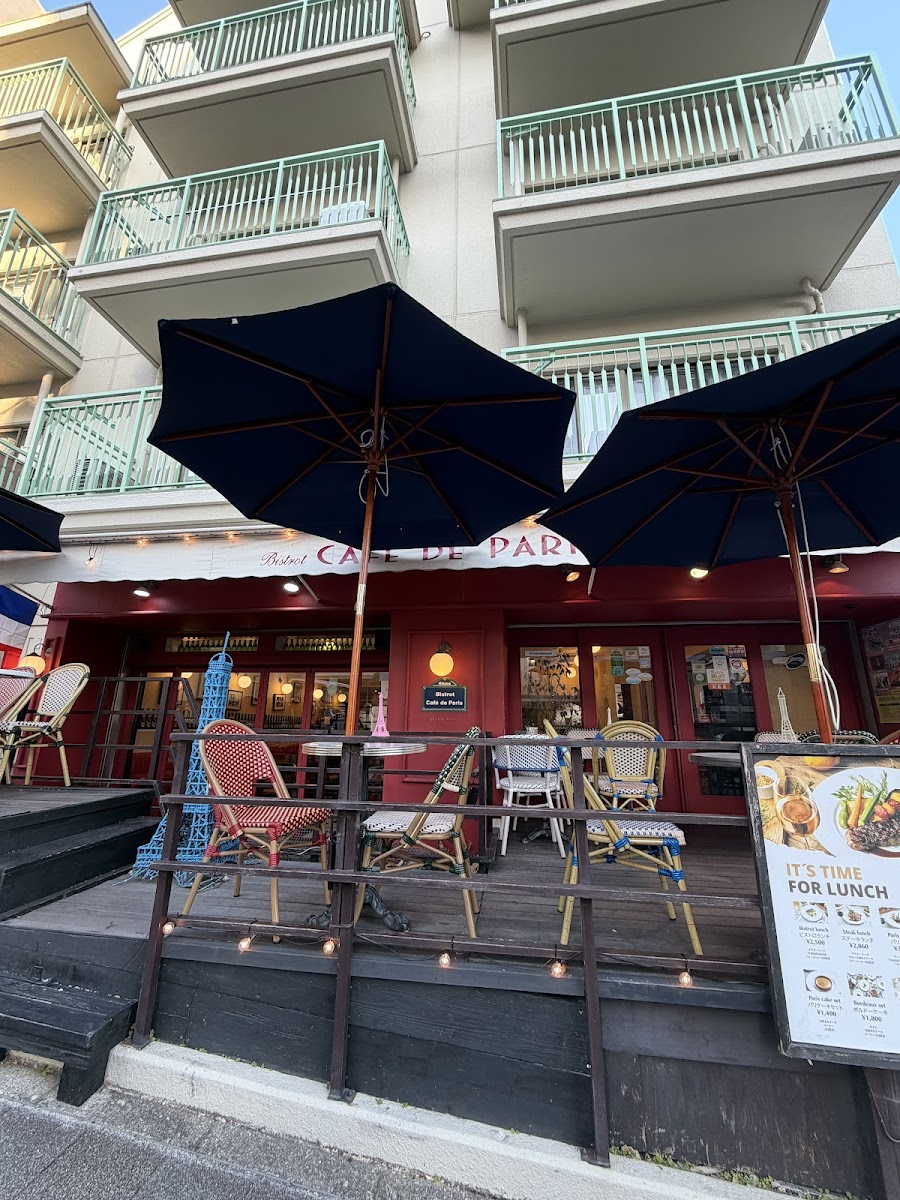 Café De Paris located at 1 Chome-7-21 山本通り, Chuo Ward, Kobe, Hyogo, Japan, is a French Restaurant with 716 reviews. The menu includes classic French dishes such as パリランチ, 牛ロースステーキ, a パリケーキセット, ホタテ貝柱のポワレ, and a steak lunch (ステーキランチ), offering a blend of lunch and specialty seafood options.