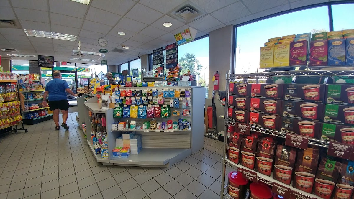 Very homely orchard Park gas station with snacks and drinks options. Small Tim Hortons in it. They have gas there to put in your car. Definitely fits the town of orchard Park vibe. You could probably find 4 people you don't really want to talk too there, but know them from high school or college so you feel obligated. However you know you're not going to enjoy the conversation so you just make small talk to get out of there as fast as possible. It's one of those gas stations.