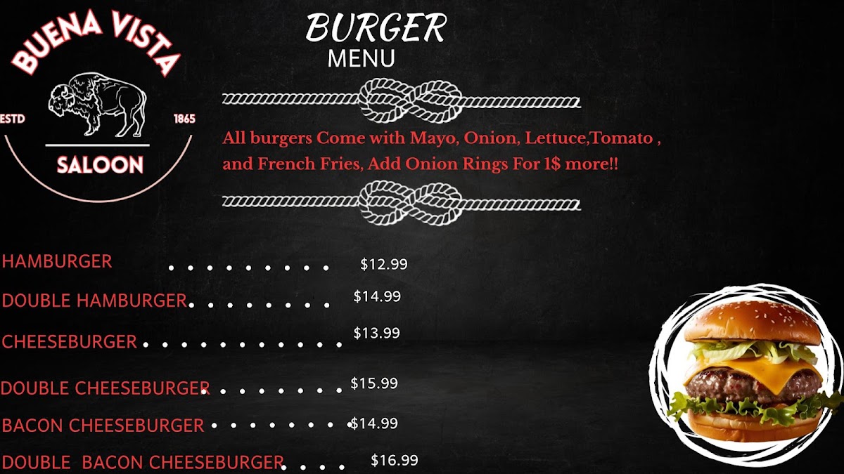 All burgers Come with Mayo, Onion, Lettuce, Tomato, and French Fries
