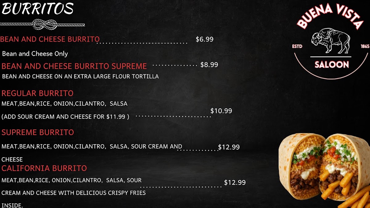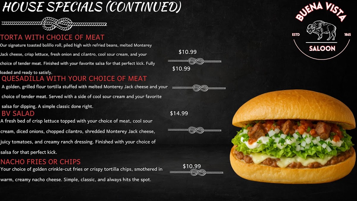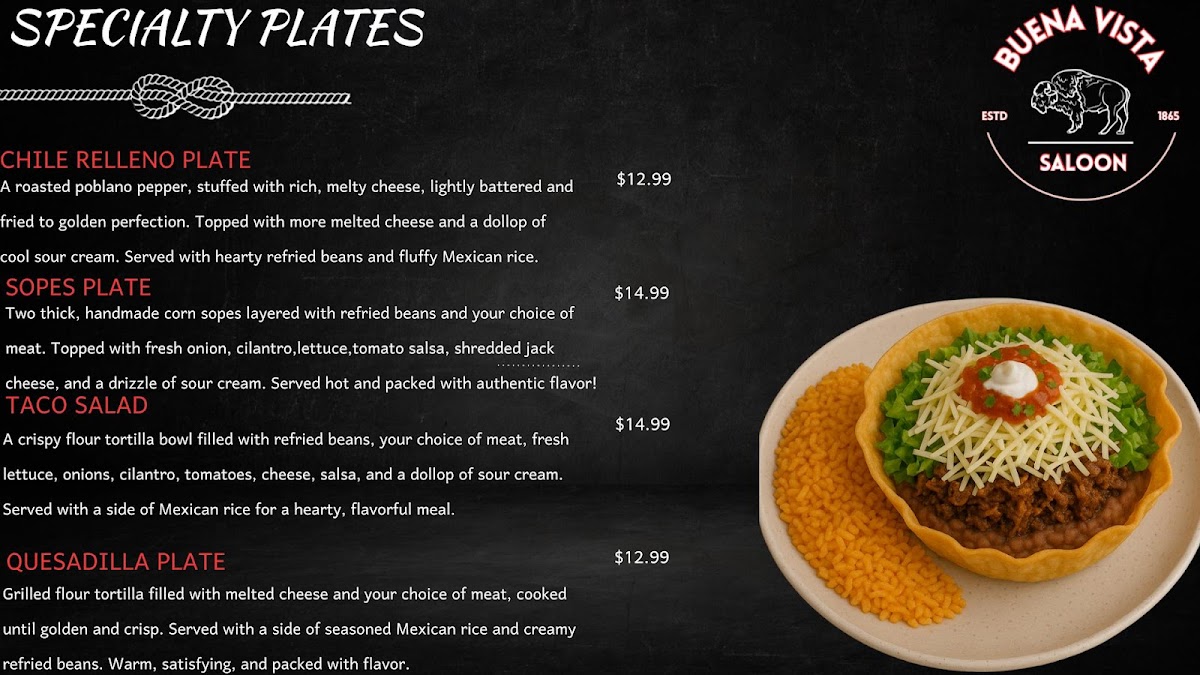Two crispy tostada shells piled high with your choice of meat, creamy refried beans, melted Monterey Jack cheese, chopped onion, fresh cilantro, crisp lettuce, and a generous dollop of sour cream. Finished with your favorite salsa for the perfect bite every time. Bold, loaded, and unforgettable-just like the Buena Vista.