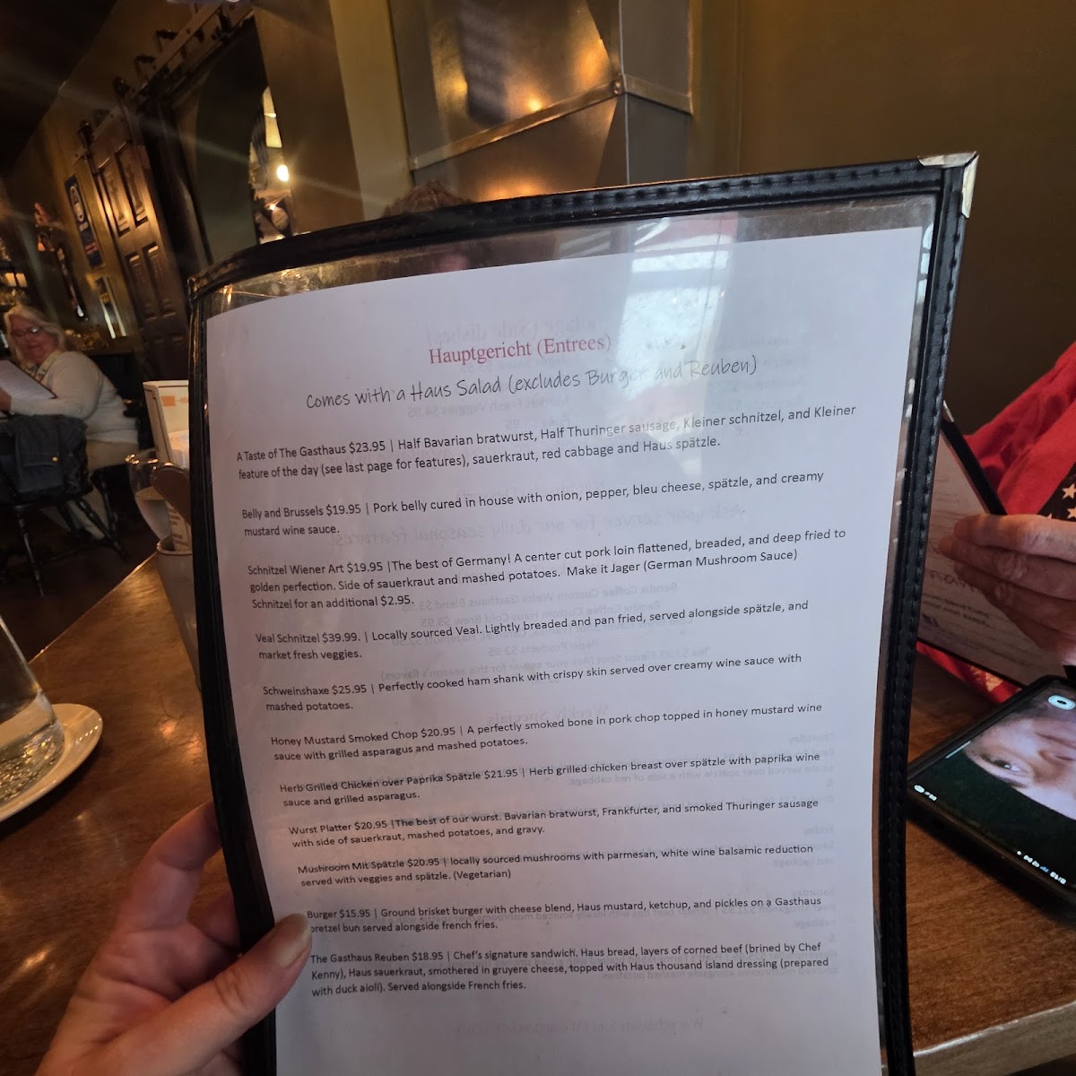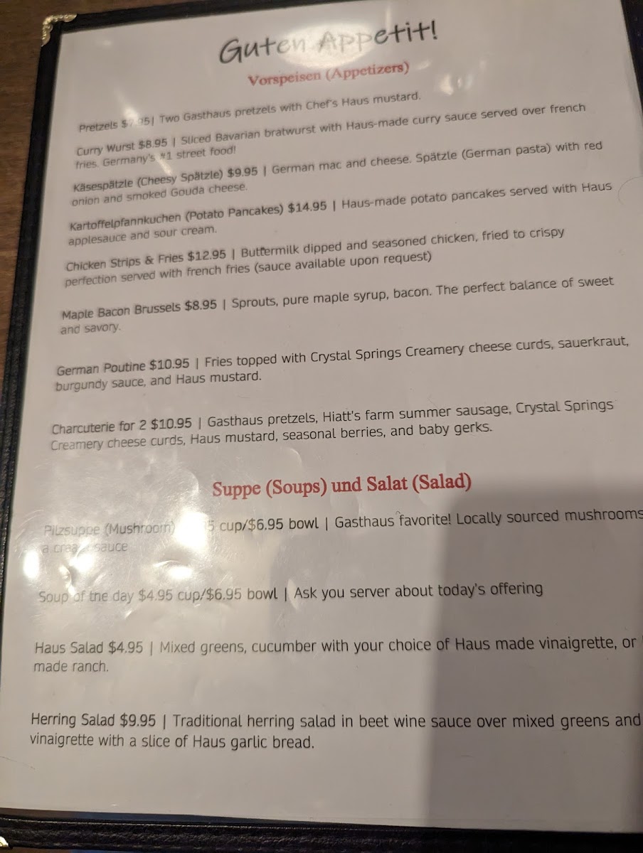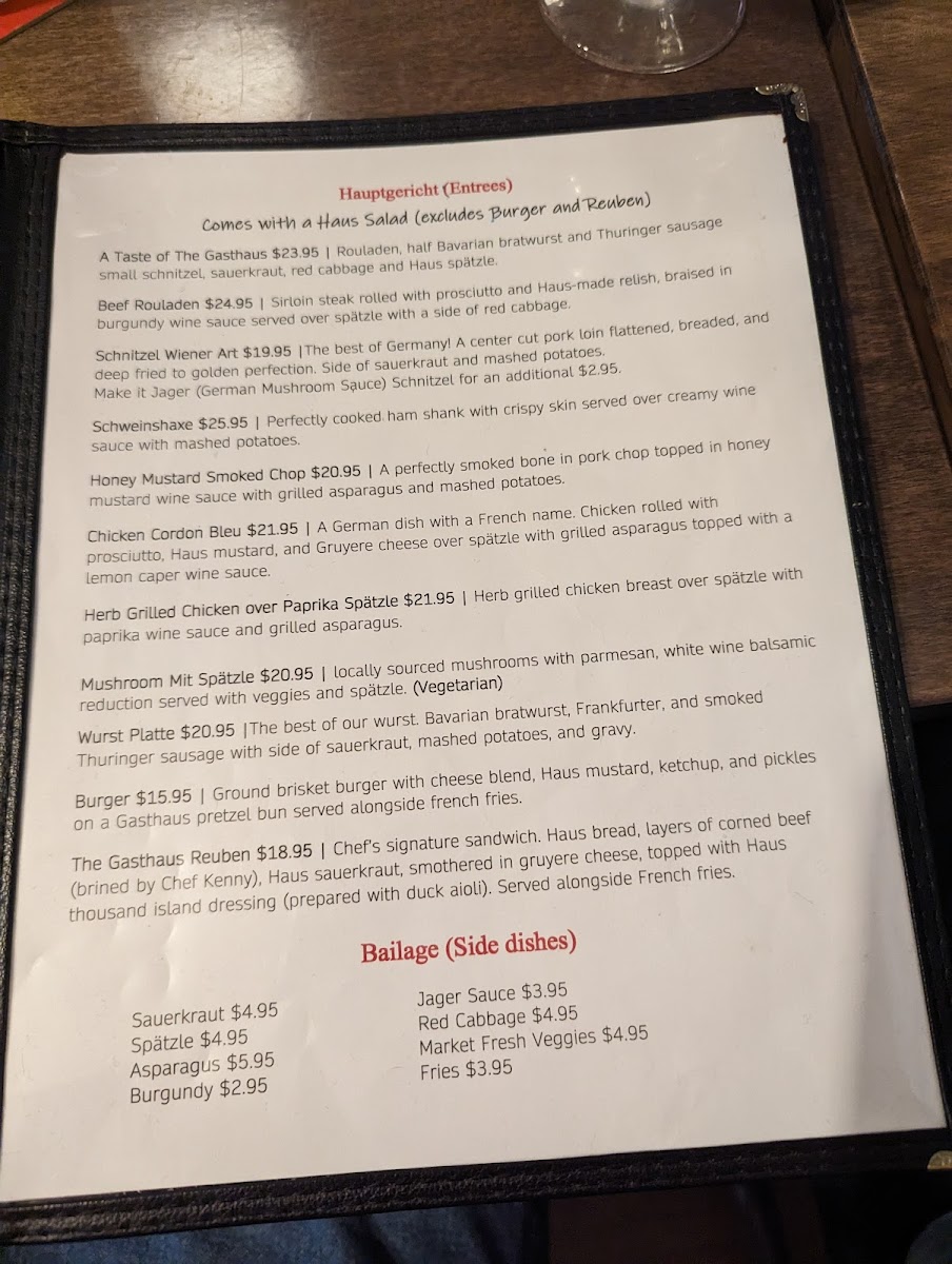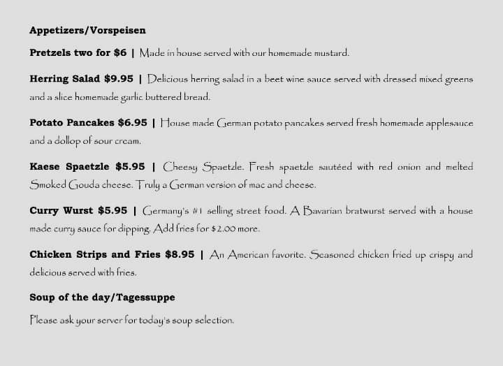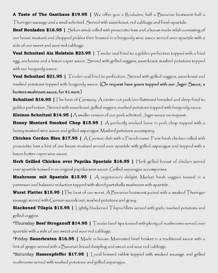 We offer you a rouladen, half a Bavarian bratwurst, half a Thuringer sausage, and a small schnitzel. Served with sauerkraut, red cabbage, and fresh spaetzle