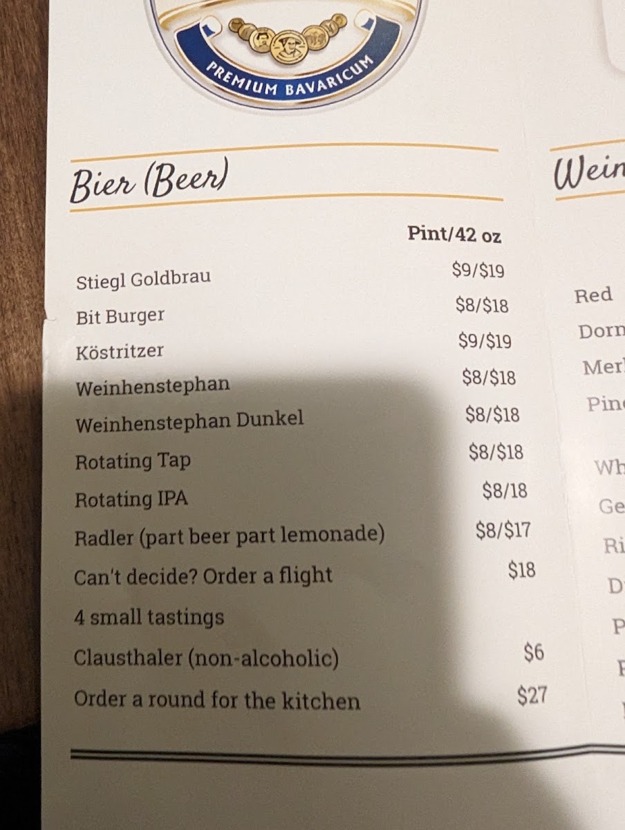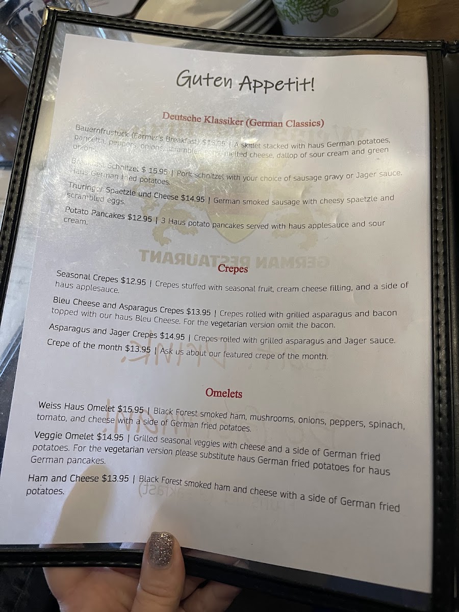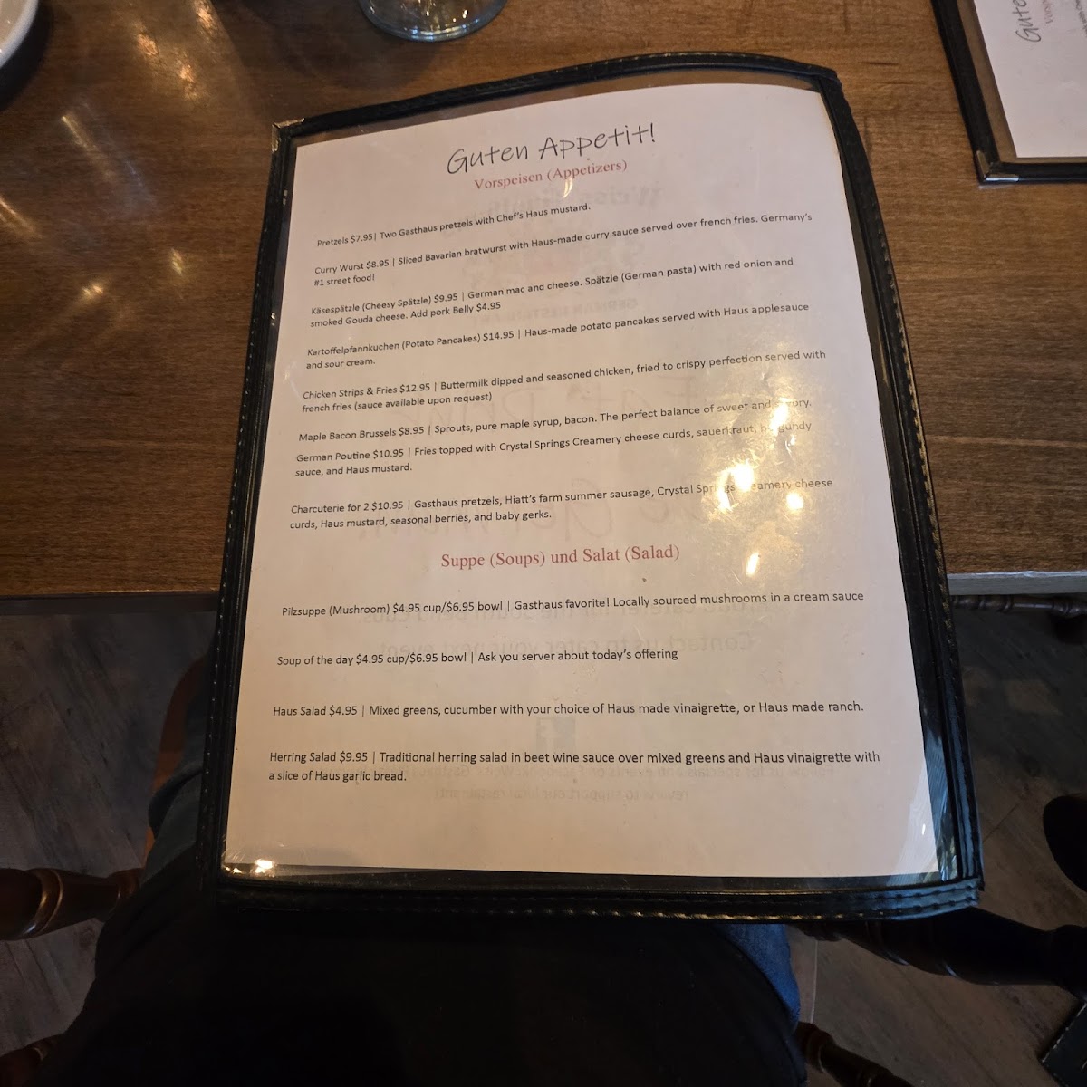 We offer you a rouladen, half a Bavarian bratwurst, half a Thuringer sausage, and a small schnitzel. Served with sauerkraut, red cabbage, and fresh spaetzle