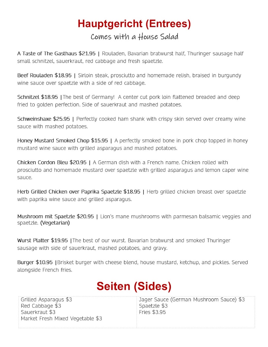 The best of our wurst. A Bavarian bratwurst paired with a Thuringer sausage, and a Frankfurt. Served with German sauerkraut, mashed potatoes, and gravy