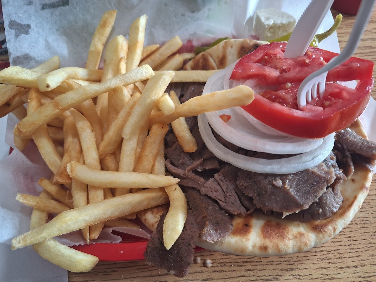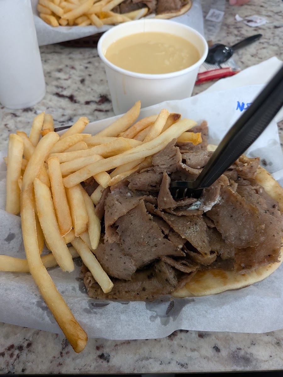 First time customer, I left here very satisfied. Hefty and flavorful gyro with plenty of homemade sauce, fresh warm pita, gyro meat, tomatoes and cucumbers. Just under 15$ out the door with lemon rice soup and McDs like but fluffuer fries. Also friend folk inside, no wait...and did I mention baklava CHEESECAKE!