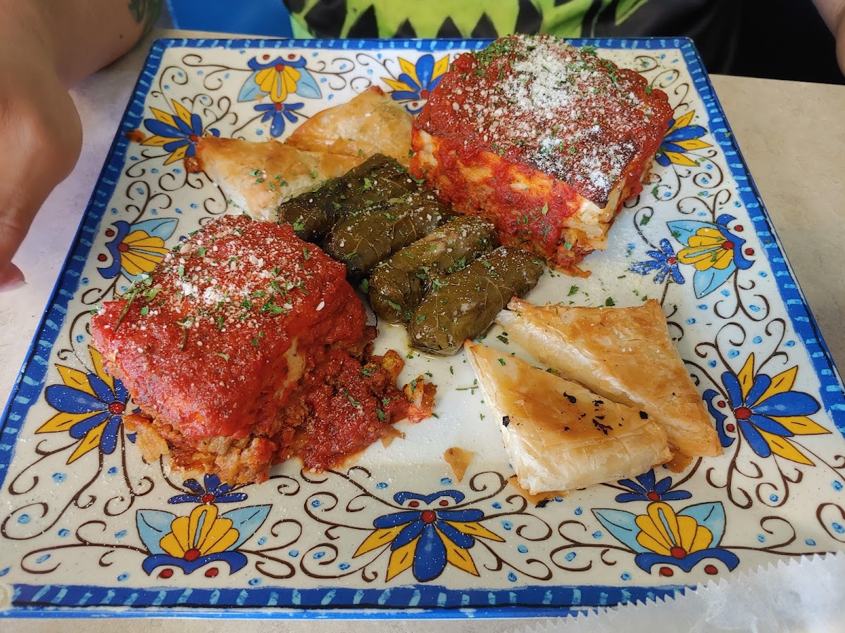 Dinner for two. Started with the spanakopita, which was delicious. I ordered the moussaka for my entree. It came with a salad (just a basic salad with ham and feta) and bread. The moussaka was yummy - well prepared and flavorful. My husband had the Stromboli, which he said was more like a calzone. It was good, but he said he probably wouldn’t order it again. We got the baklava cheesecake for dessert. Flavor was great, but the phyllo on top was a little rubbery and hard to cut instead of crispy and flaky. I’m sure that was from being kept in the cooler. Overall, we enjoyed our meal and I would go back again just for that spanakopita!