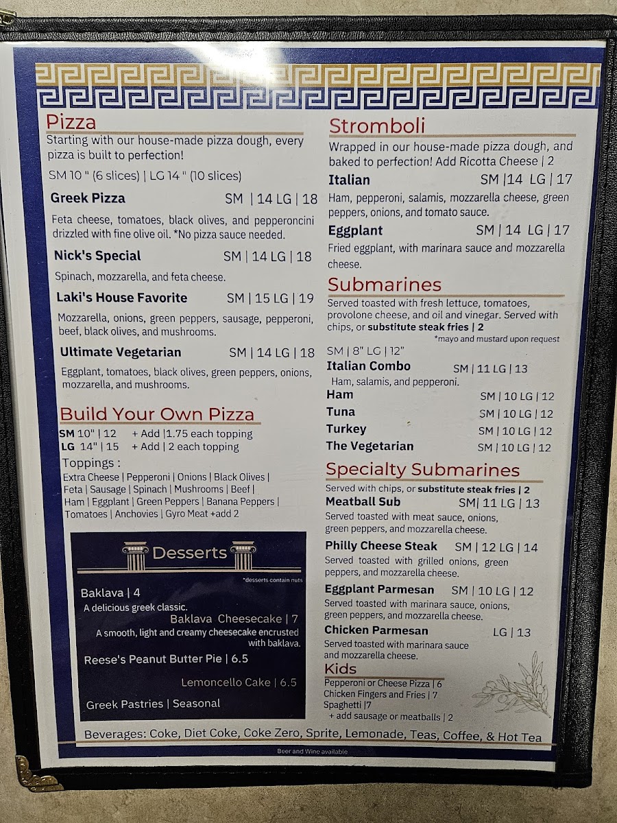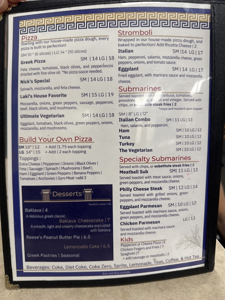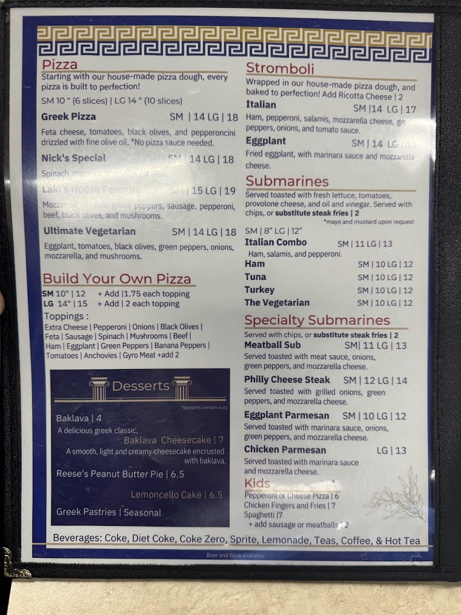 Extra cheese | Pepperoni | Onions | Black olives | Feta | Sausage | Spinach | Mushrooms | Beef | Ham | Eggplant | Green peppers | Banana Peppers | Tomatoes | Anchovies | Gyro meat (+add | $1.50)
