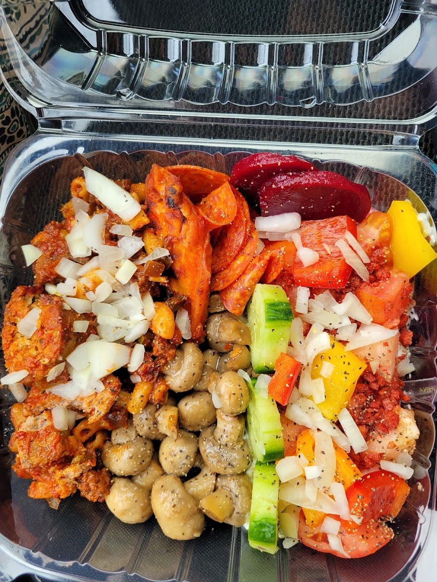 Pretty good selection of lunch food. Home cooked too. Lasagna, baked chicken,etc,etc. Pizza subs. The price was OK I guess. It's buy the pound for the hot stuff