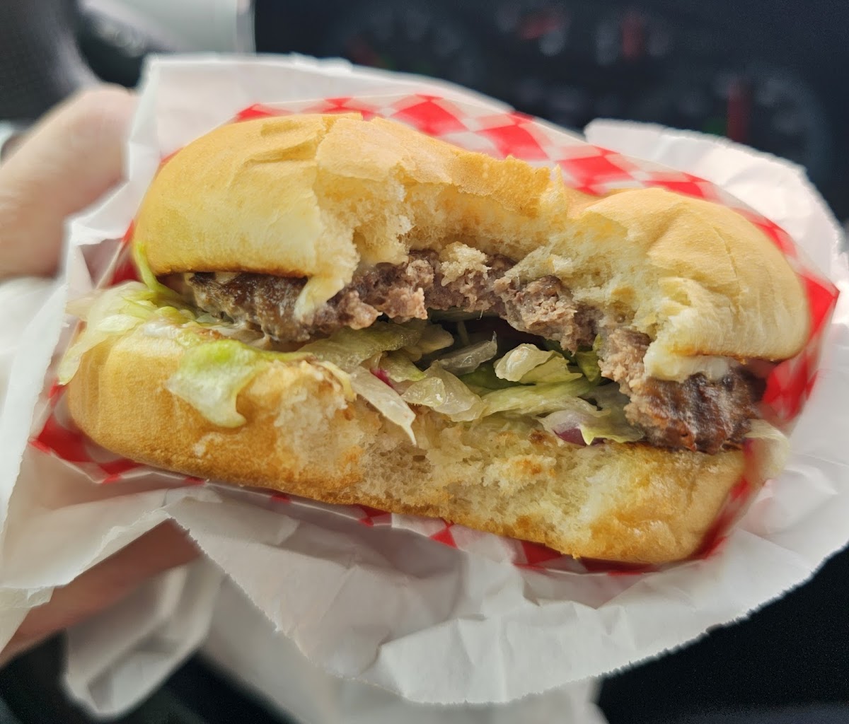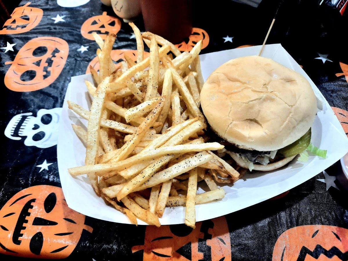 Great Burger. Had the special of the day that was a avacoto burger that came with fries. Convenient stop off the highway frequented by many coming and going. Large outdoor seating area too.