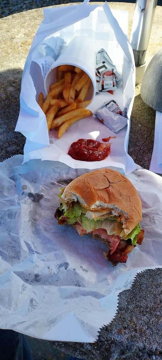 Surprisingly, an awesome burger , crisp fries all tied in a friendly staff bow . Tiny building - big flavor !