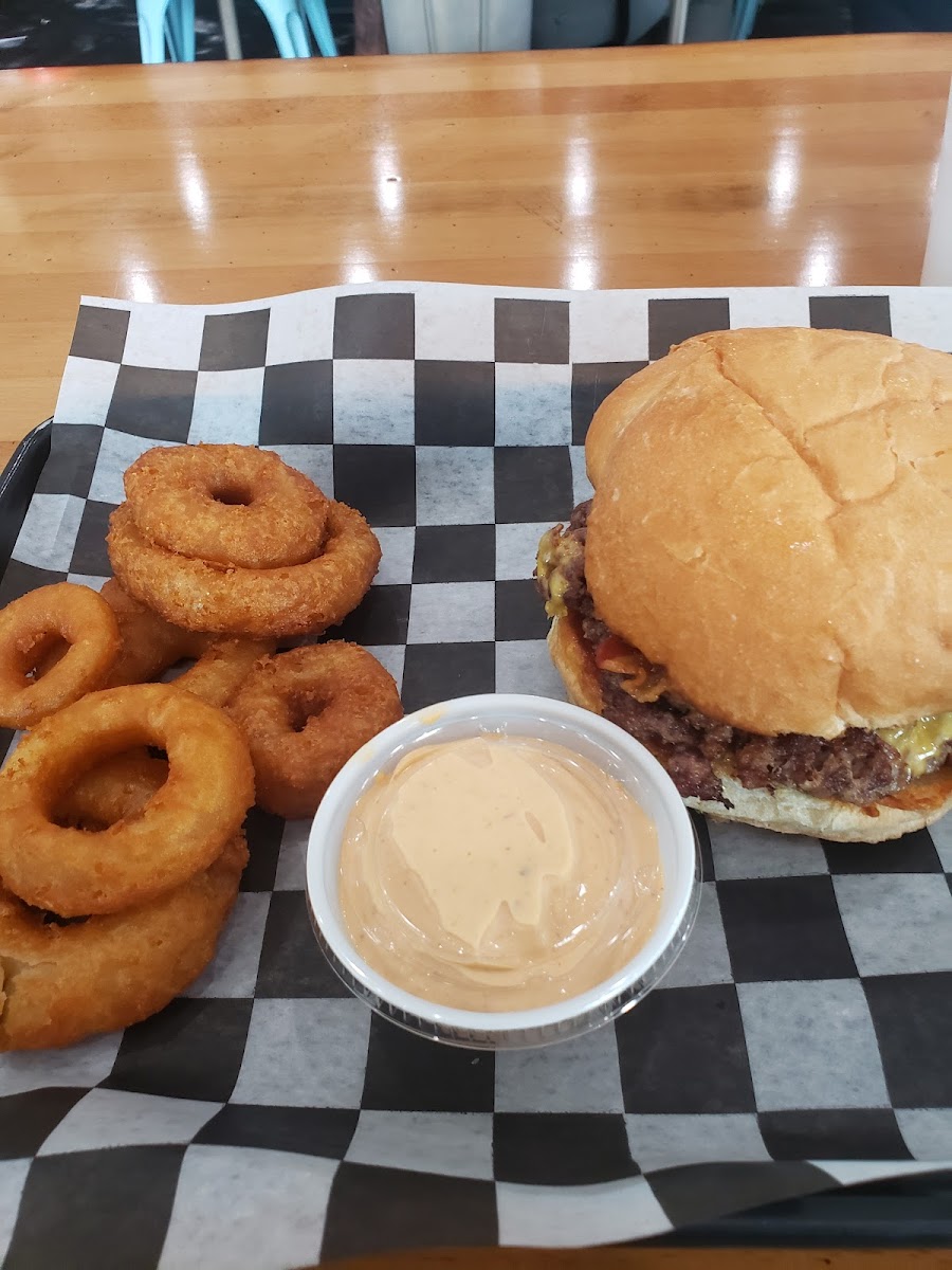 This place was awesome! Better than any fast food burgers. Service was quick and they even have a patio. Wings were crispy and cooked well. Burger was just delicious. Onion rings were good too! Will have to try a shake and their pizza next time!