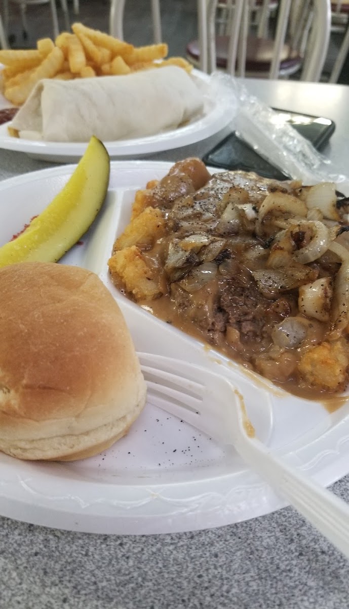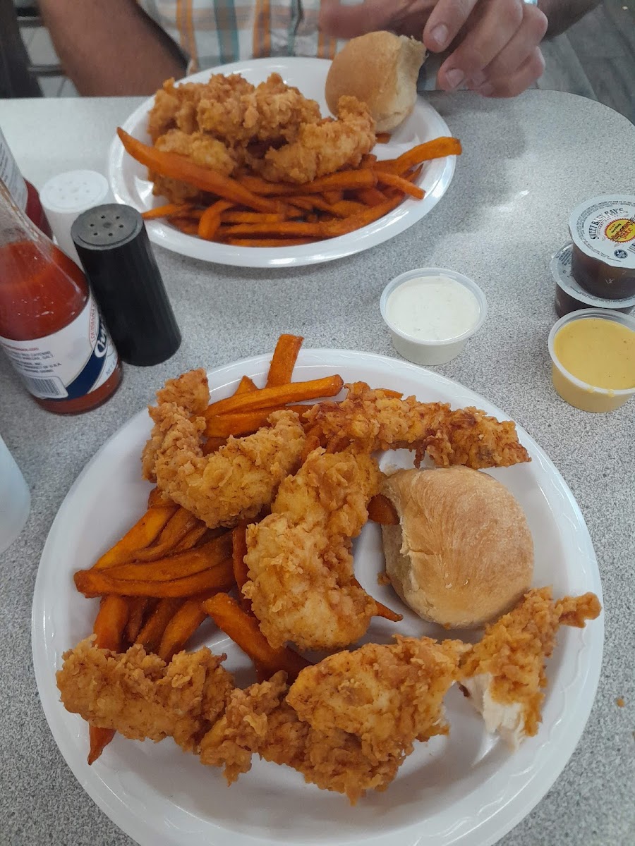 Very good food, always hot & fresh. We got 2 chicken strip dinners, includes fries or sweet potato fries & yeast roll. We added salad to the entree for $3.99(good salad bar) and iced tea. Total bill $35