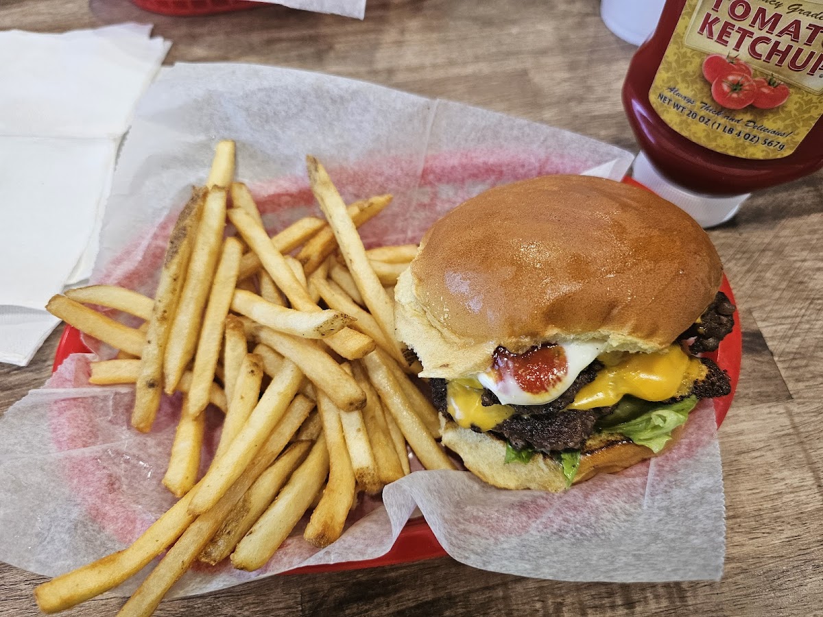 Super delicious smash burgers. They were rolling the burgers into balls when we arrived. Burgers were nice and juicy and the bread was fresh. The lettuce, tomato and onions were nice and fresh. The sweet potato waffle fries with Kens ButterMilk dipping sauce (on the side) were hot and super delicious. They are open seven days a week. And they are open for breakfast.