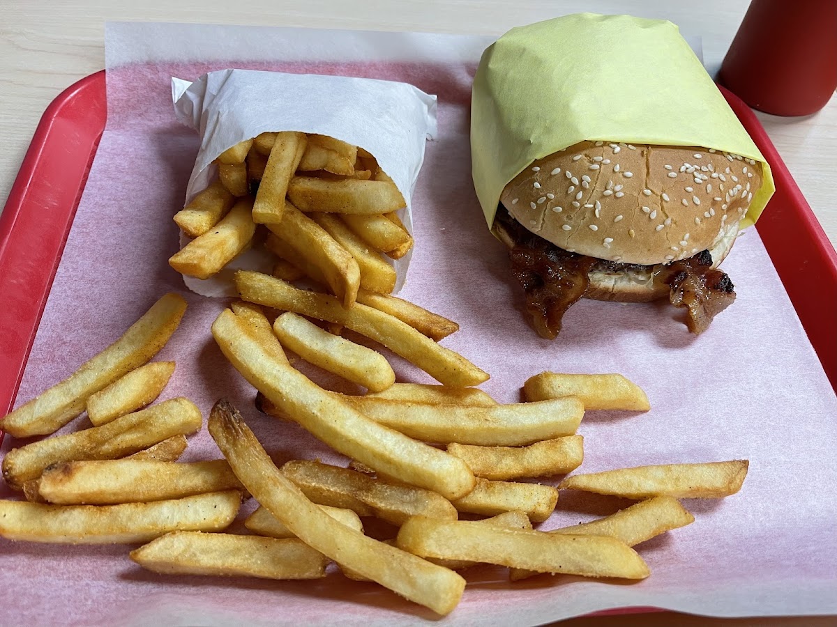 We were driving through and saw this on the fast food options. The fries restored my faith in fries and the hamburger was really great ( kind of like a homemade whopper ). Prices are a bit higher due to being a local business, but only a few bucks more than a regular fast food chain. If you're driving they come wrapped on the old fashion style with one open end so the wrapper catches all the burger remnants while you're eating. I'd recommend, 5 stars