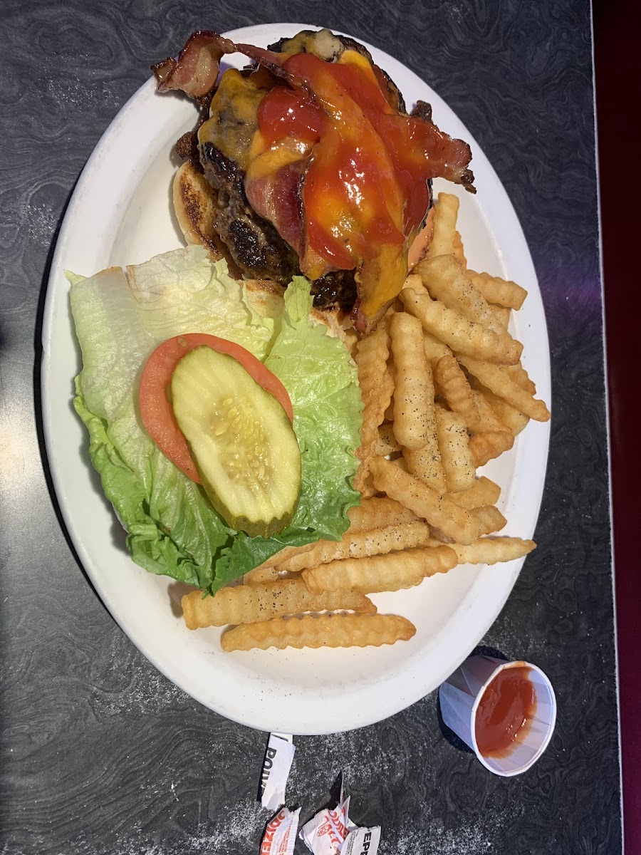 If you want to go back in time to the 70's, this is your place. We came here 10 years ago and nothing has changed, not even a bit. The prices have gone up, but not much. If you are hungry but on budget - eat here. Their burgers are huge, I mean huge. My husband had a trouble eating it. My liver (and I know this will sound odd, but I am a fan of liver) would have been amazing if it hadn't been covered in paper bag gravy. I must say plain canned corn wasn't my favorite side but it was ok. The milkshake we shared as dessert was way to big for 3 of us, but we enjoyed it. The service was great. The Indian lady with long beautiful hair was very helpful and nice.