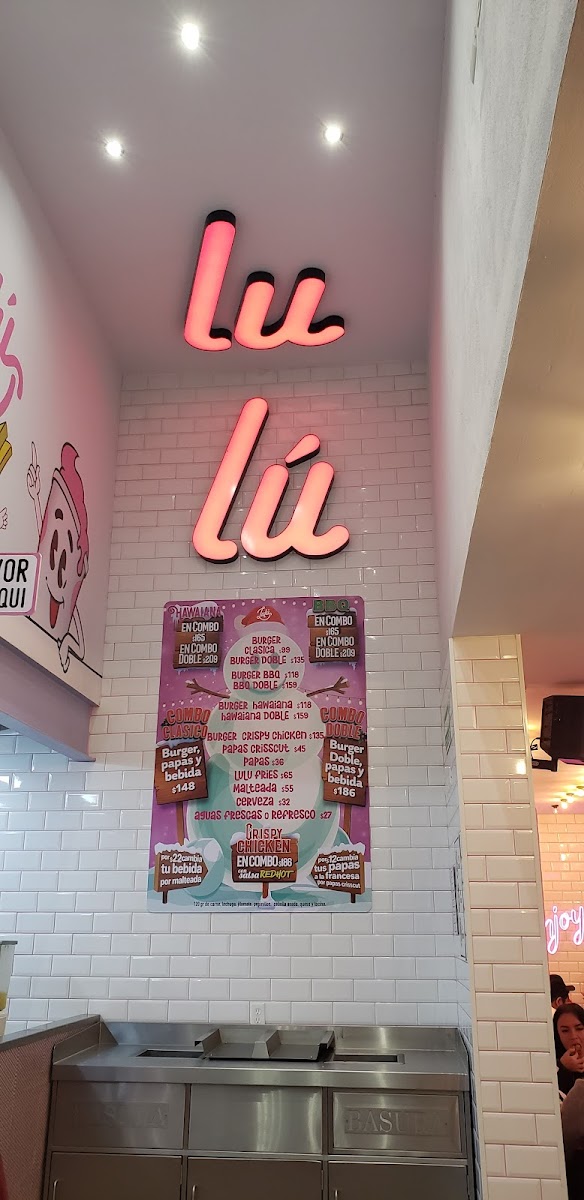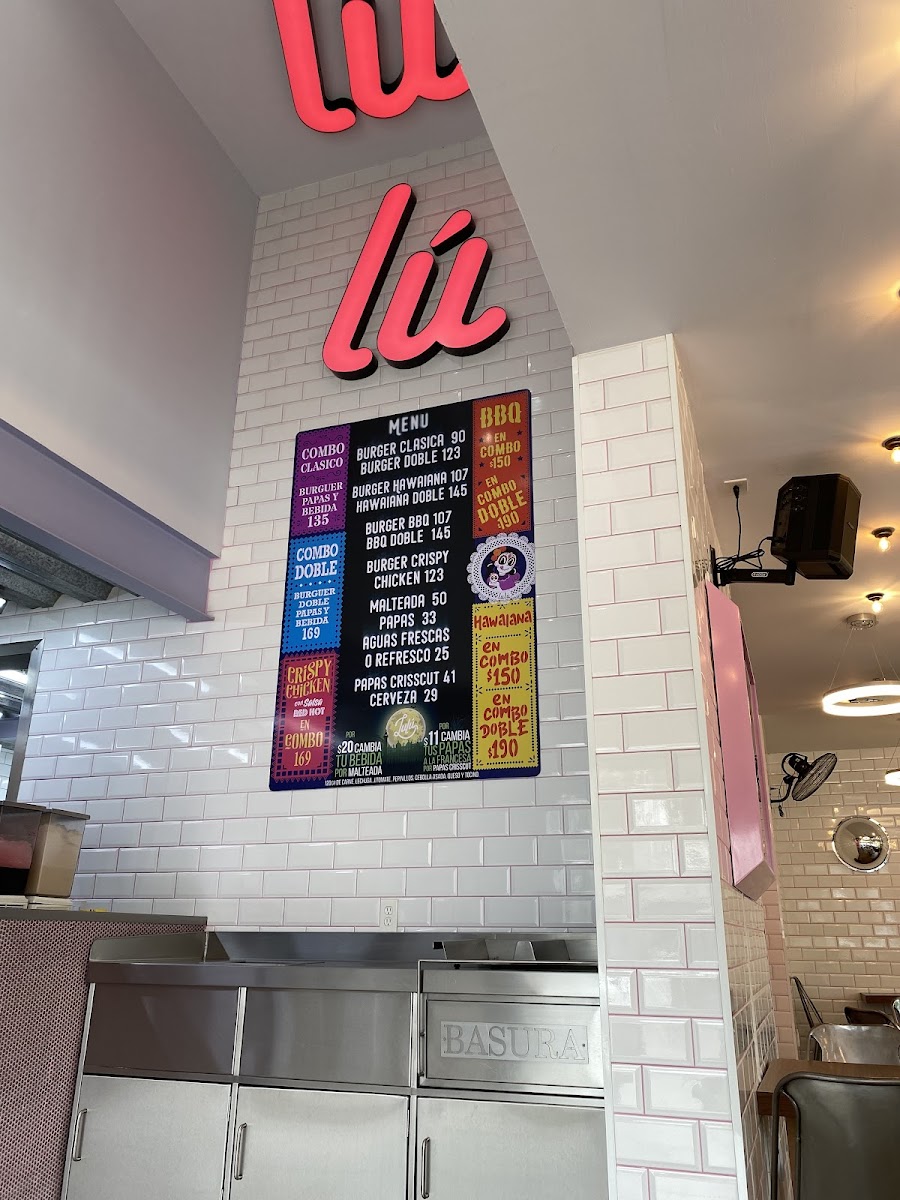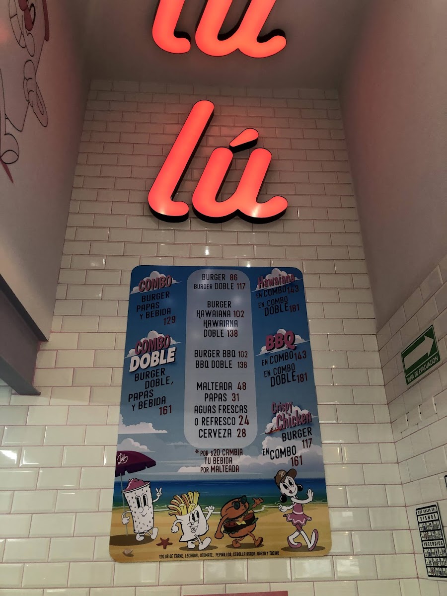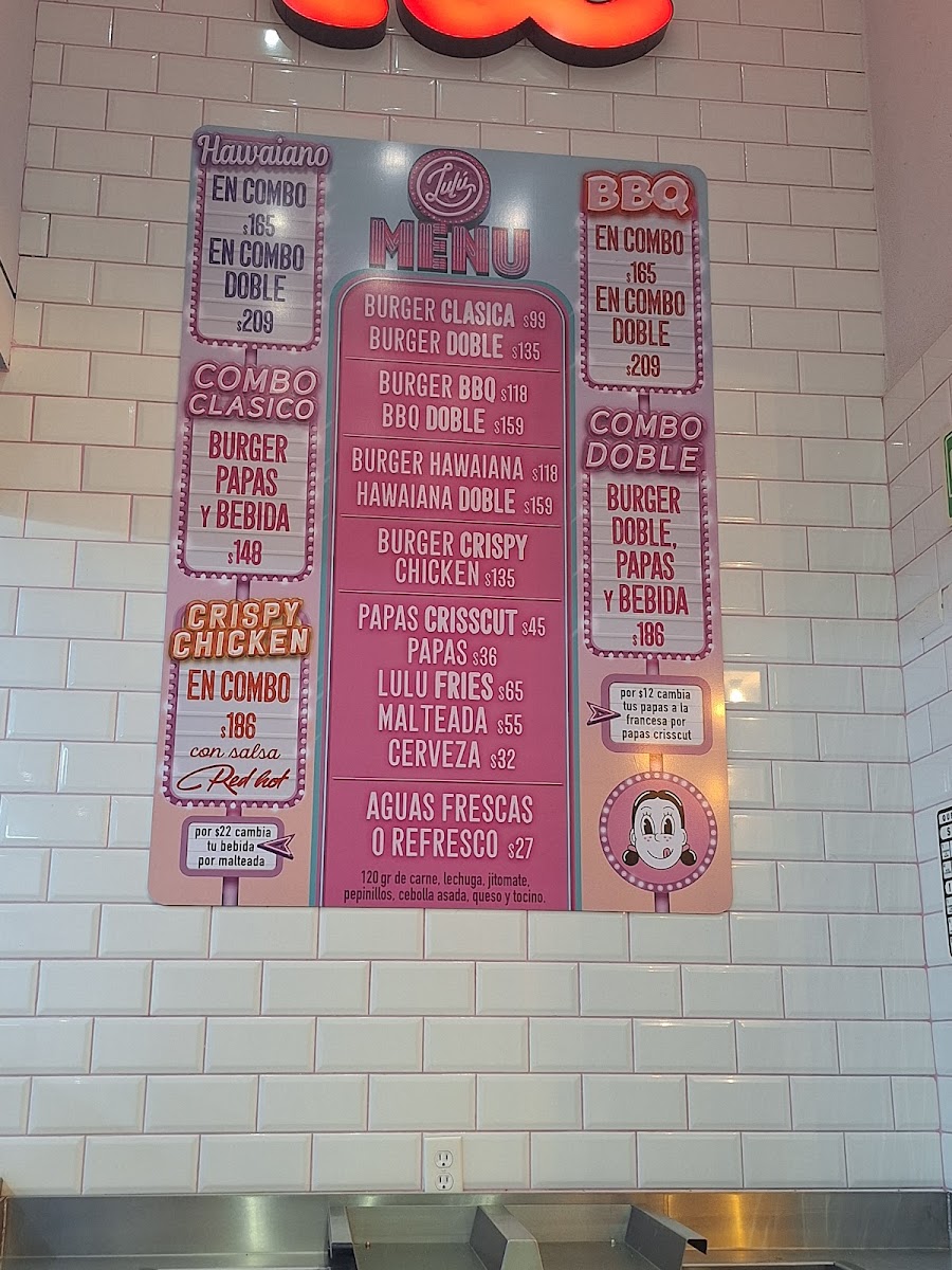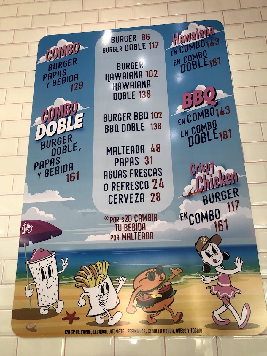 120Gr de carne (2 piezas), lechuga, jitomate, pepinillos, cebolla asada, tocino y una rebanada de piña asada.