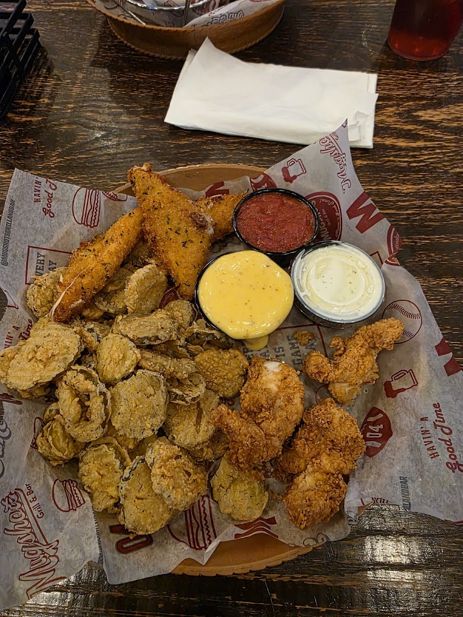 Great place for burgers, sandwiches and beer. Can get crowded and noisy. 4 of 5 of us were happy with our sandwiches. Chicken strips not so much. Jalyn our server did a pretty good job. Can’t say much about the wait staff having to carry food as far as they do. Especially up some stairs. I’d come back.